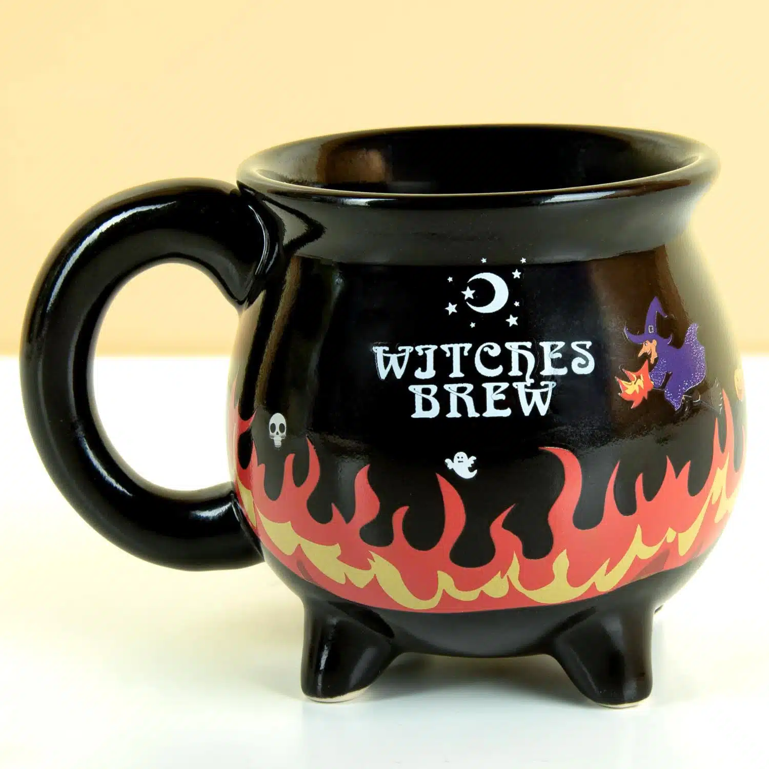 Auf den ersten Blick wirkt die Witches Brew wärmeempfindliche Tasse vielleicht nicht besonders spektakulär. Sie sieht aus wie ein Becher, der von einem Hexenkessel inspiriert ist – und genau das ist sie auch. Aber sobald du heißen Tee oder Kaffee hineinschütten, eröffnet sich dir eine magische Welt. Auf der Tasse erscheint eine fliegende Hexe auf einem Besen, ein kleines Gespenst, ein böser Kürbis und gefährliche Flammen in Orange und Gelb. Wenn das Getränk abkühlt, verschwinden diese Elemente wieder.