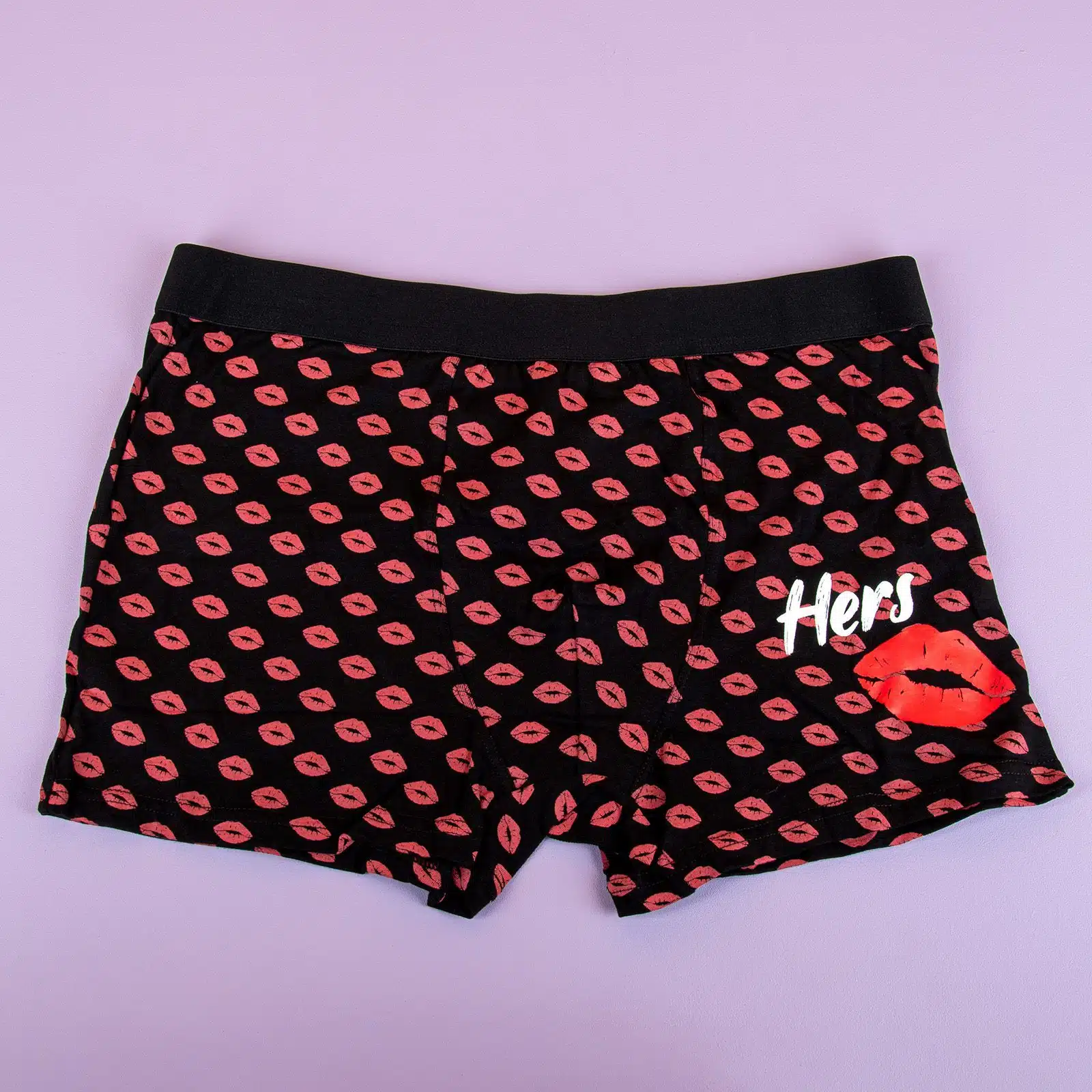 - Seine Boxershorts hat rote Lippen und die Aufschrift „hers“