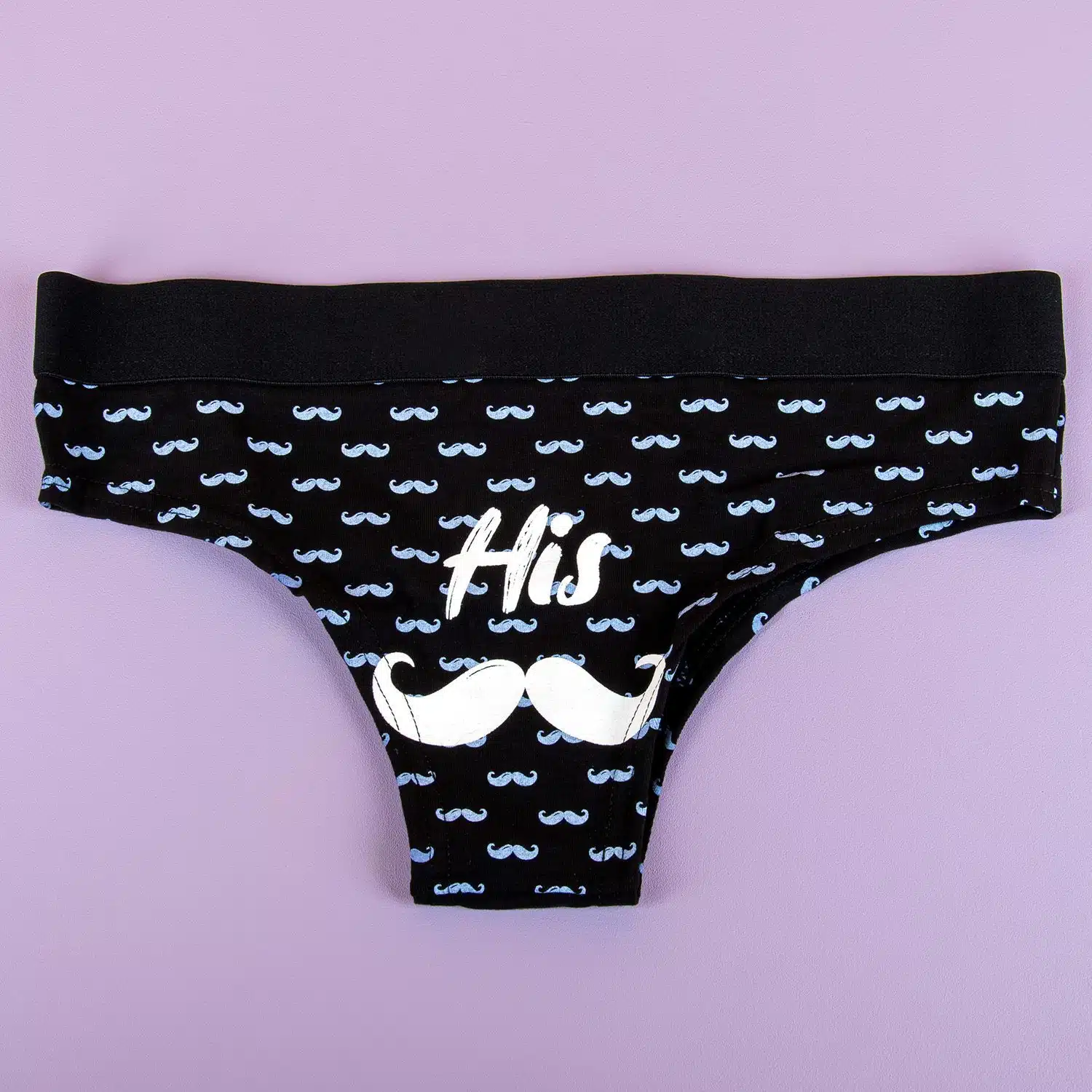 - Ihr Slip hat ein Schnurrbartmuster und die Aufschrift „his“