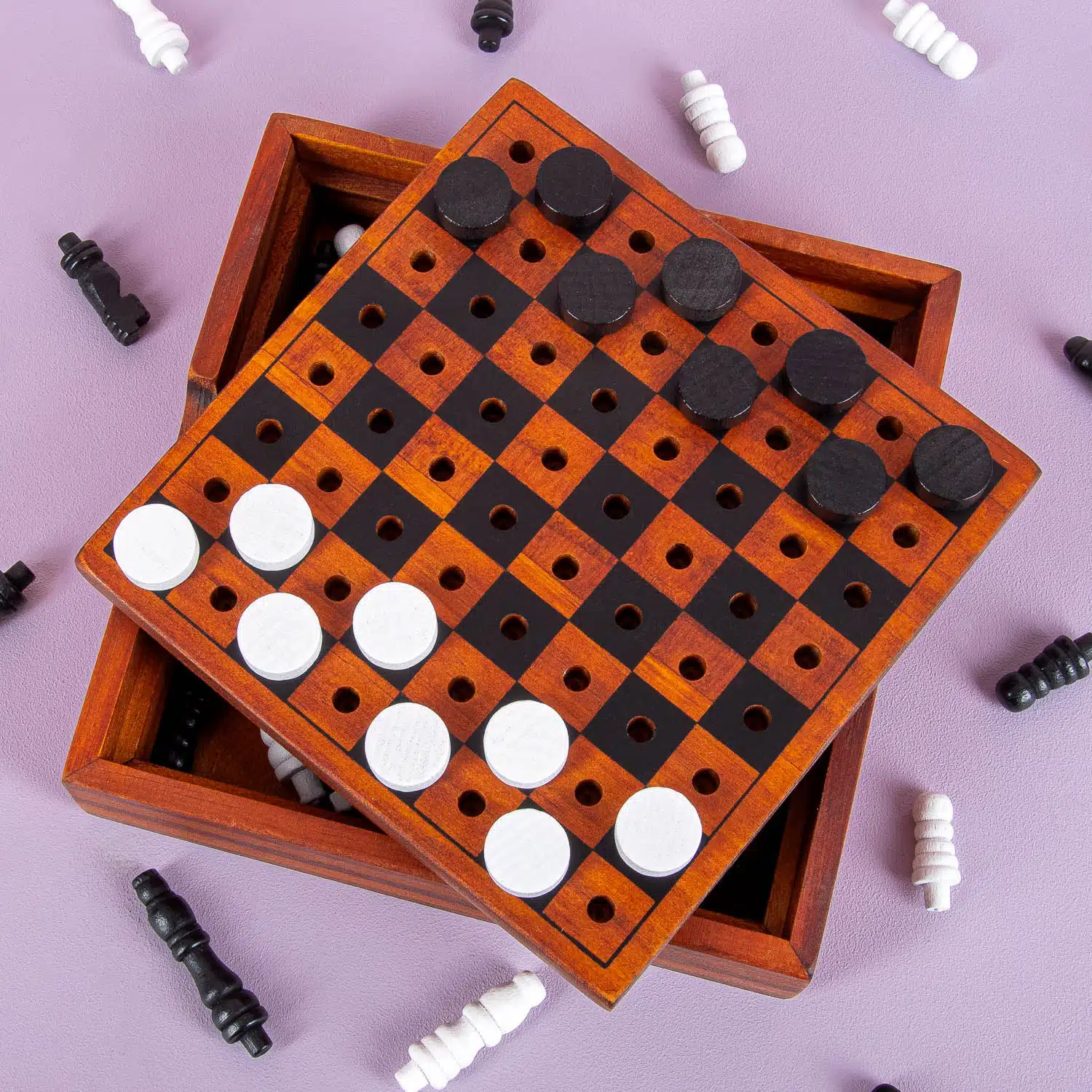 • Kompaktes, hölzernes Dame- und Schachspiel