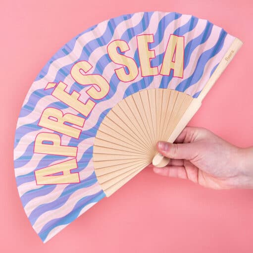 Après-ski kennst du – aber Après-sea ist besser. Der Holzfächer Après Sea von Fisura ist ein fröhlicher Fächer mit blauen und weißen Wellen und dem Text APRÈS SEA in Gelb. Perfekt nach dem Schwimmen, am Strand oder einfach wenn es warm ist und du dir im Urlaub etwas Kühle zufächeln willst.