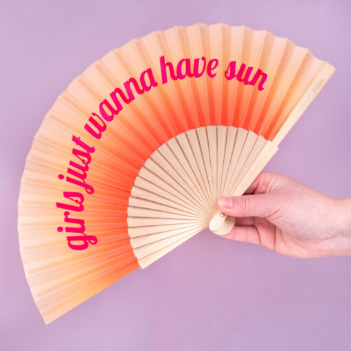 - Holzfächer in orangefarbenem Ombré mit dem Text Girls Just Wanna Have Sun