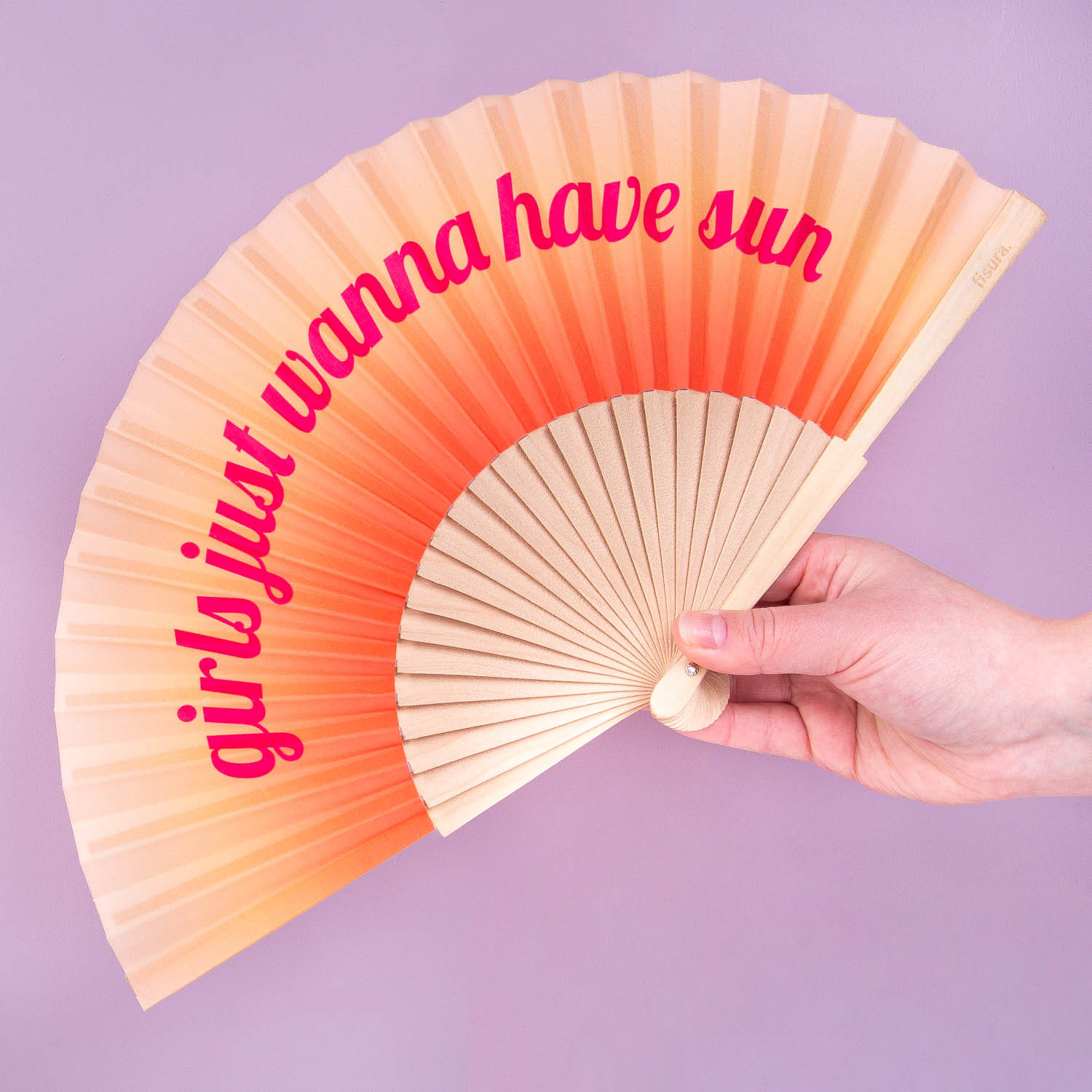 Spaß ist gut, Sonne ist besser! Der Holzfächer Girls Just Wanna Have Sun von Fisura ist ein fröhlicher Fächer in orangefarbenem Ombré mit dem Text GIRLS JUST WANNA HAVE SUN in rosa Buchstaben. Perfekt für den Strand, Festivals oder einfach wenn das Wetter enttäuscht und du die sommerliche Stimmung festhalten willst.