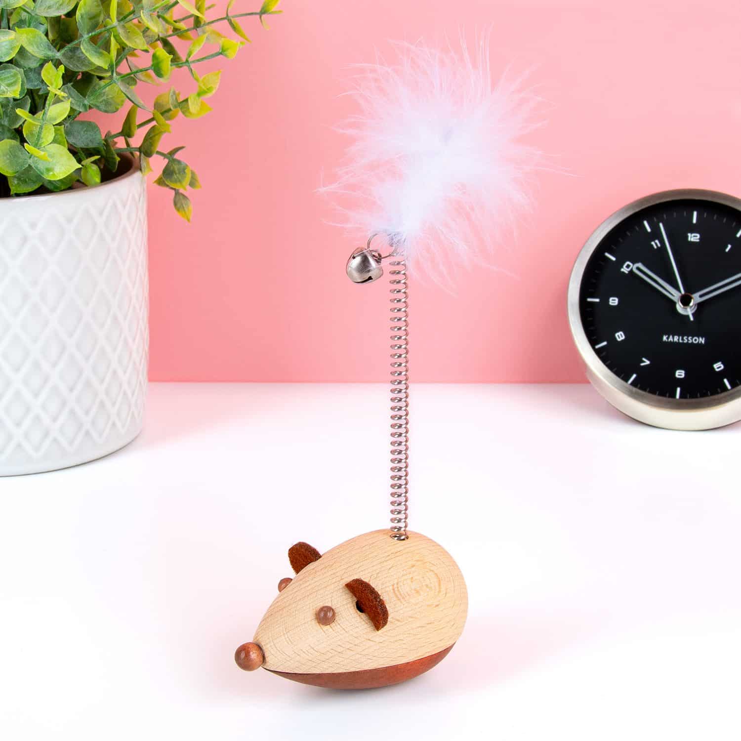 Hast du eine Katze, die dir als รberraschung jeden Tag eine echte Maus auf die Fuรmatte legt? Vielleicht kann das Holzmaus Katzenspielzeug von Kikkerland diese unangenehme Angewohnheit stoppen. Auf jeden Fall sorgt es fรผr viel Unterhaltung: Das kleine Holzmรคuschen hat einen flexiblen Schwanz aus einer Sprungfeder, an dem ein Glรถckchen und Federn befestigt sind.