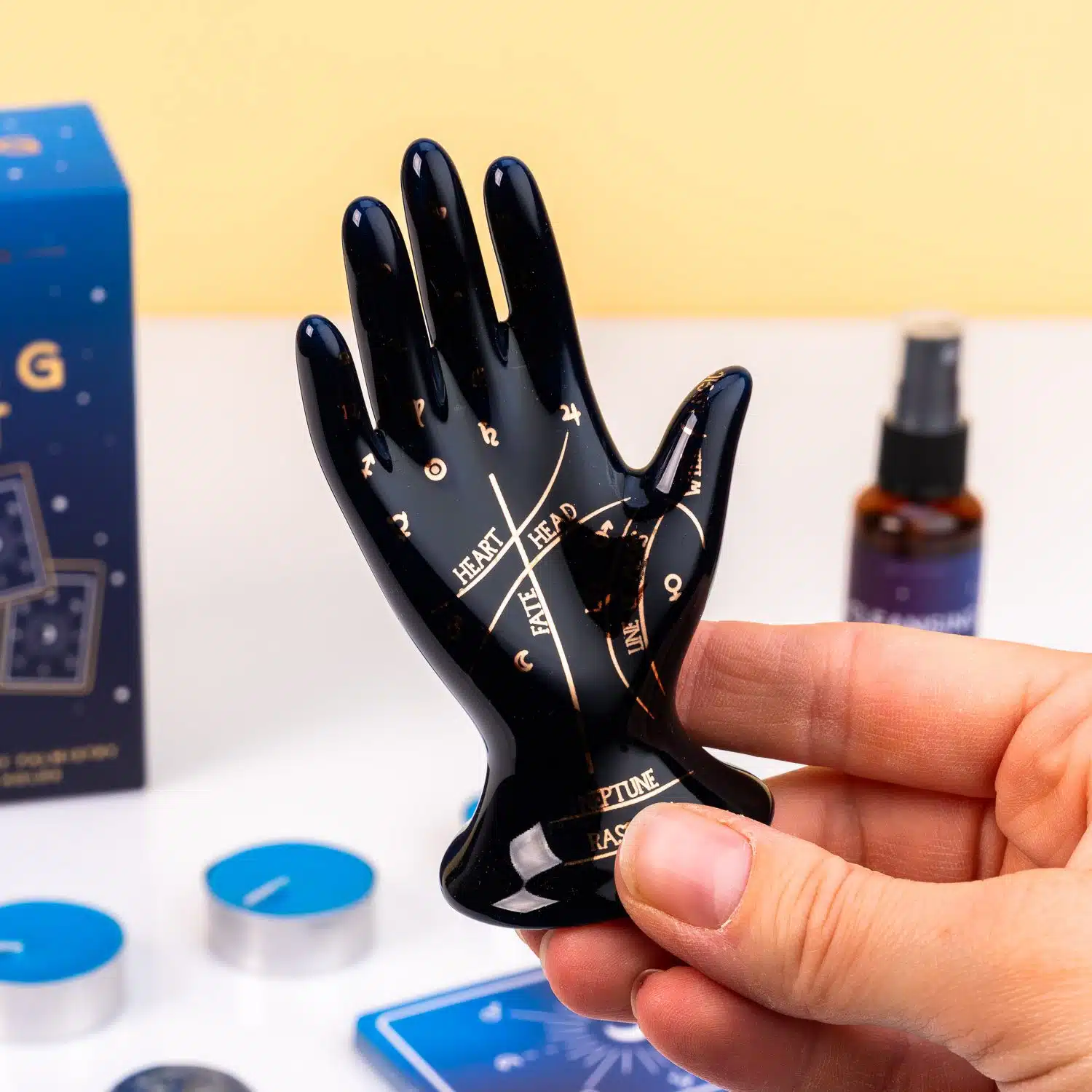 • Inhalt Handlesen: Keramik Hand, drei Sandelholz-Teelichter, zwanzig begleitende Karten, Kristall und Reinigungsspray