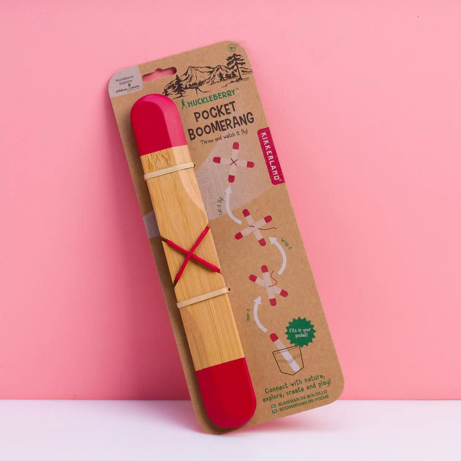 Ist dein Kind am liebsten den ganzen Tag drauรen oder mรถchtest du es dazu ermutigen, mehr Zeit im Freien zu verbringen? รberrasche ihn oder sie mit dem Huckleberry Pocket-Bumerang. Dieser Bumerang ist sehr einfach mitzunehmen, da er zusammengeklappt werden kann. Drehe ihn in die richtige Position, und er ist einsatzbereit. Dieses Produkt ist Teil der Huckleberry-Kollektion von Kikkerland, die das Ziel hat, Kinder wieder mit der Natur zu verbinden.
