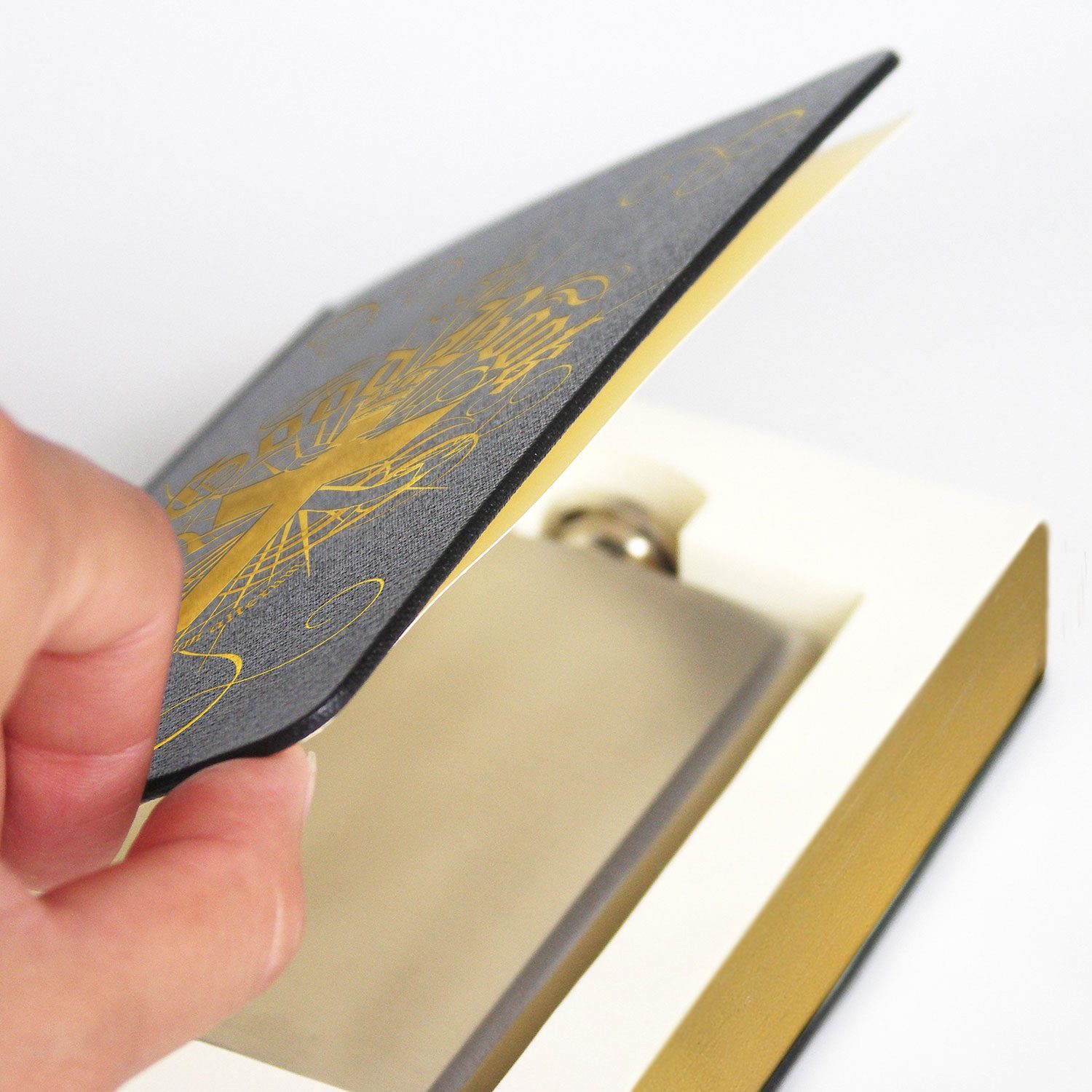- In der Mitte des Buches befindet sich eine Hüftflasche