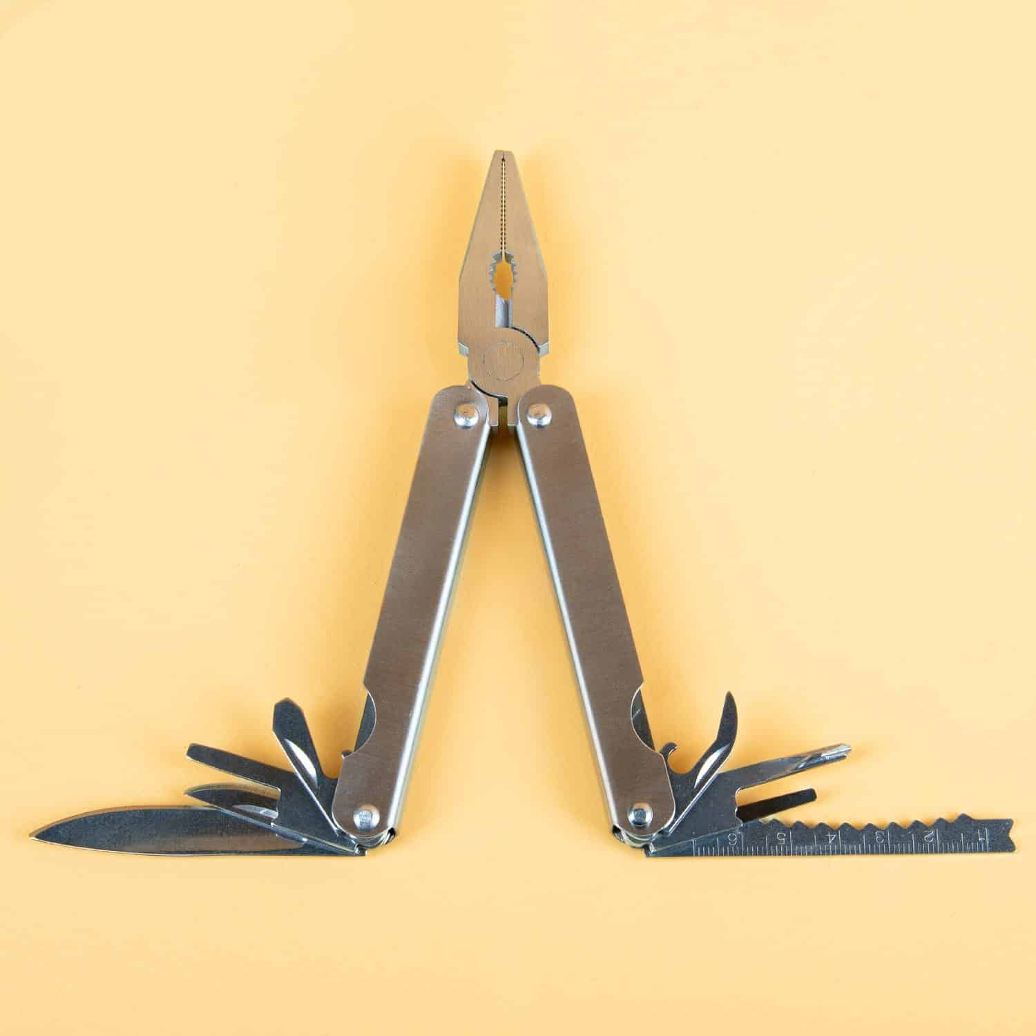 - Das Multitool enthält u.a. Klingen, Schraubendreher, einen Flaschenöffner und Zangen