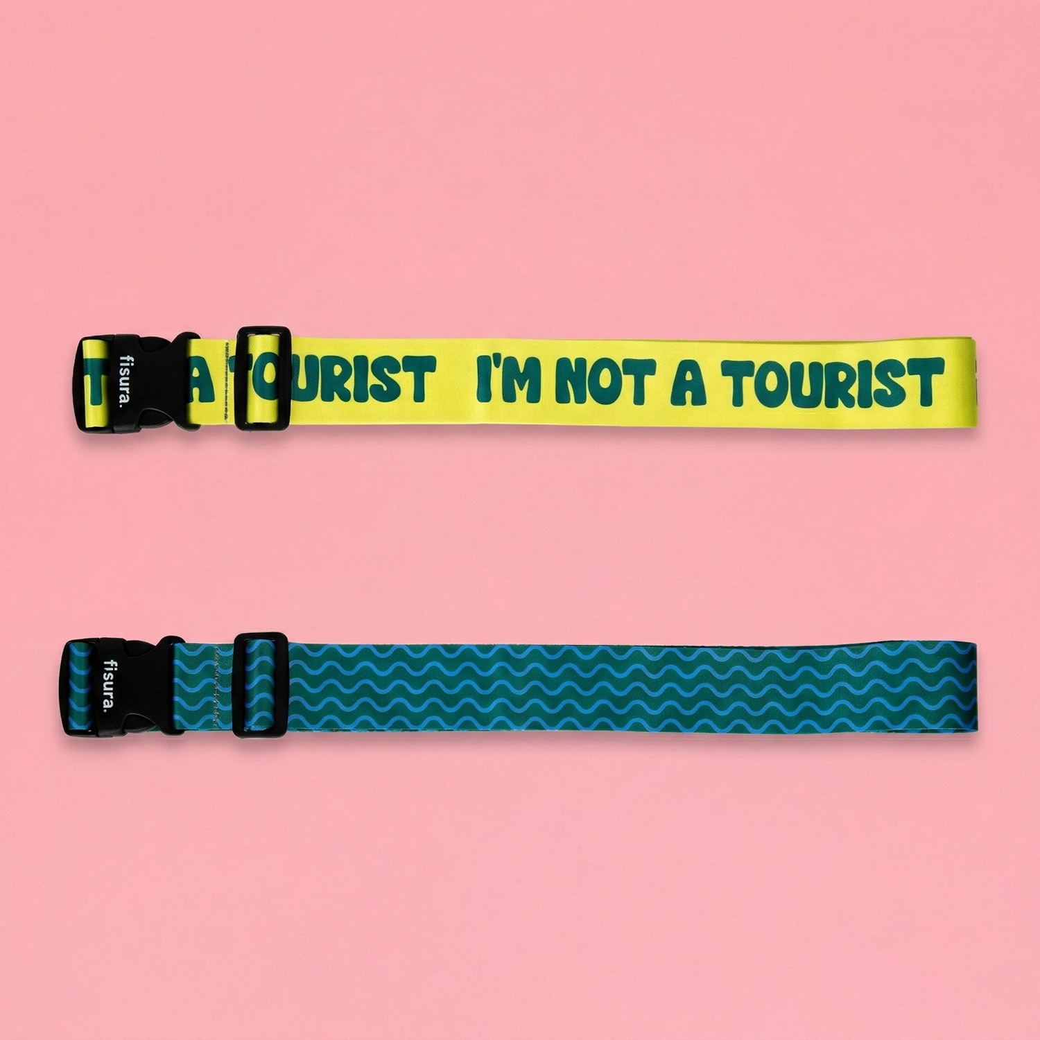 Andere haben ein langweiliges Etikett an ihrem Koffer: Du hast die I’m Not a Tourist Koffergurte von Fisura. Dieses Set aus zwei verstellbaren Gurten in Grรผn und Gelb lรคsst alle am Gepรคckband wissen, dass du hier zu Hause bist. Ein Gurt mit dem Text I’M NOT A TOURIST und einer in Grรผn mit frรถhlichem Muster: Zusammen sorgen sie dafรผr, dass du deinen Koffer immer als Erster erkennst.