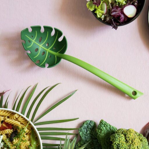 Auch für Veganer ist es praktisch, einen Sieblöffel in der Küche zu haben. Dieser Jungle-Sieb-Löffel von Ototo hilft dir, zum Beispiel Zoodles, also Zucchini-Nudeln, aus dem Topf auf deinen Teller zu schöpfen. Und das alles, ohne Kochwasser oder Flüssigkeit auf den Teller zu bekommen. Das liegt daran, dass der grüne Servierlöffel Schlitze und Löcher hat, durch die überschüssiges Wasser ablaufen kann. Hänge diesen Sieblöffel an ein Regal, und deine Küche bekommt sofort einen grünen Akzent. Jeder – vor allem Veganer – weiß, dass ein bisschen Grün im Haus nie schaden kann.