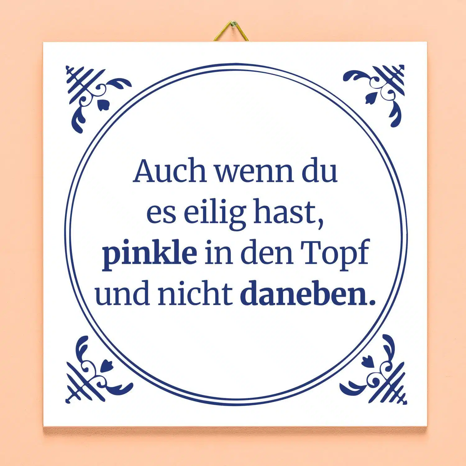 Kommst du regelmäßig mit nassen Socken aus der Toilette? Das ist das Zeichen, dass etwas schief läuft. Mit der Kachel Auch wenn du es eilig hast… erinnerst du deine Mitbewohner und Besucher daran, wofür der weiße glänzende Topf im Toilettenraum eigentlich gedacht ist. Auf der Fliese steht der Text: Auch wenn du es eilig hast, pinkle in den Topf und nicht daneben. Eine Art Weisheit von Oma, in einem modernen Gewand.