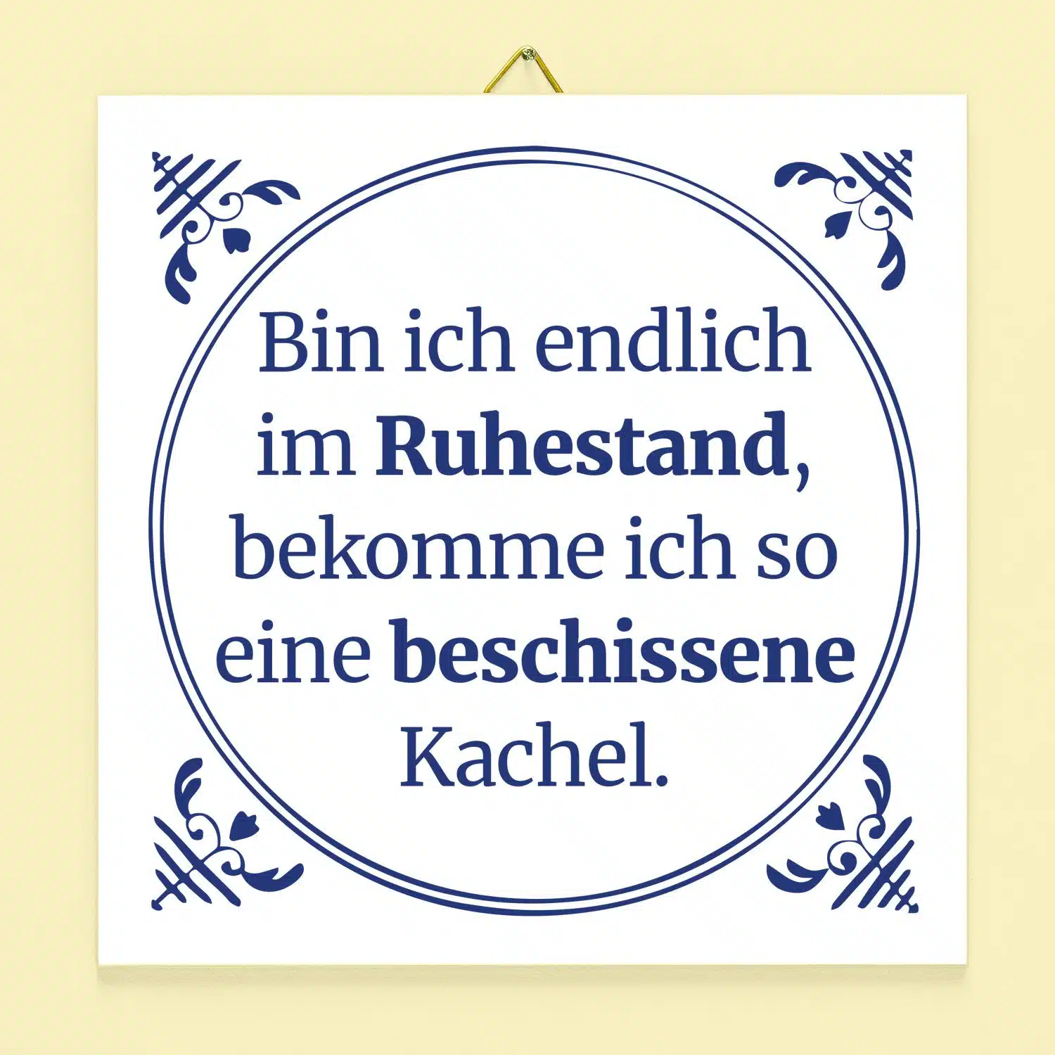 Nach über fünfzig Arbeitsjahren geht dein alter Kollege endlich in Rente. Das muss gefeiert werden und natürlich darf ein Geschenk nicht fehlen. Das Kachel Bin ich endlich im Ruhestand ist natürlich sehr passend. Der Kachel hat ein von Delfter Blau inspiriertes Design und trägt den Text: Bin ich endlich im Ruhestand, bekomme ich so eine beschissene Kachel. Zweifellos ein Erfolg!