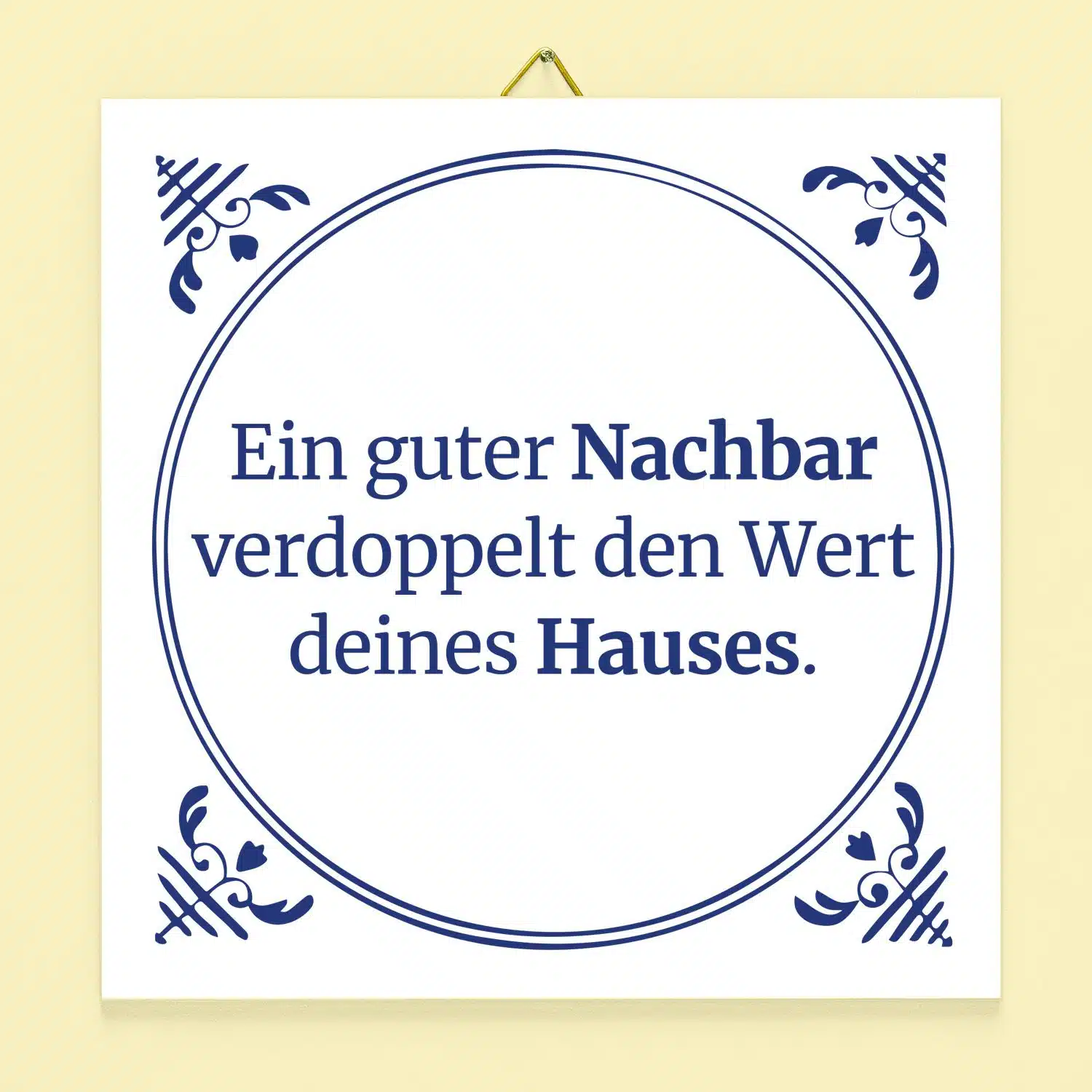 Überraschen Sie Ihre neuen Nachbarn mit einem einzigartigen Willkommensgeschenk: das Kachel Ein guter Nachbar. Auf dieser Fliese im Delfter Blau-Design steht der Text: Ein guter Nachbar verdoppelt den Wert deines Hauses. Es ist ein lustiges Kachel, das man zum Beispiel bei einem Einzug oder wenn sie umziehen, an seine Nachbarn geben kann. Das Fliese ist aus echter Keramik hergestellt und kann sowohl aufgestellt als auch an der Wand aufgehängt werden. Ein Aufhängehaken ist im Lieferumfang enthalten.