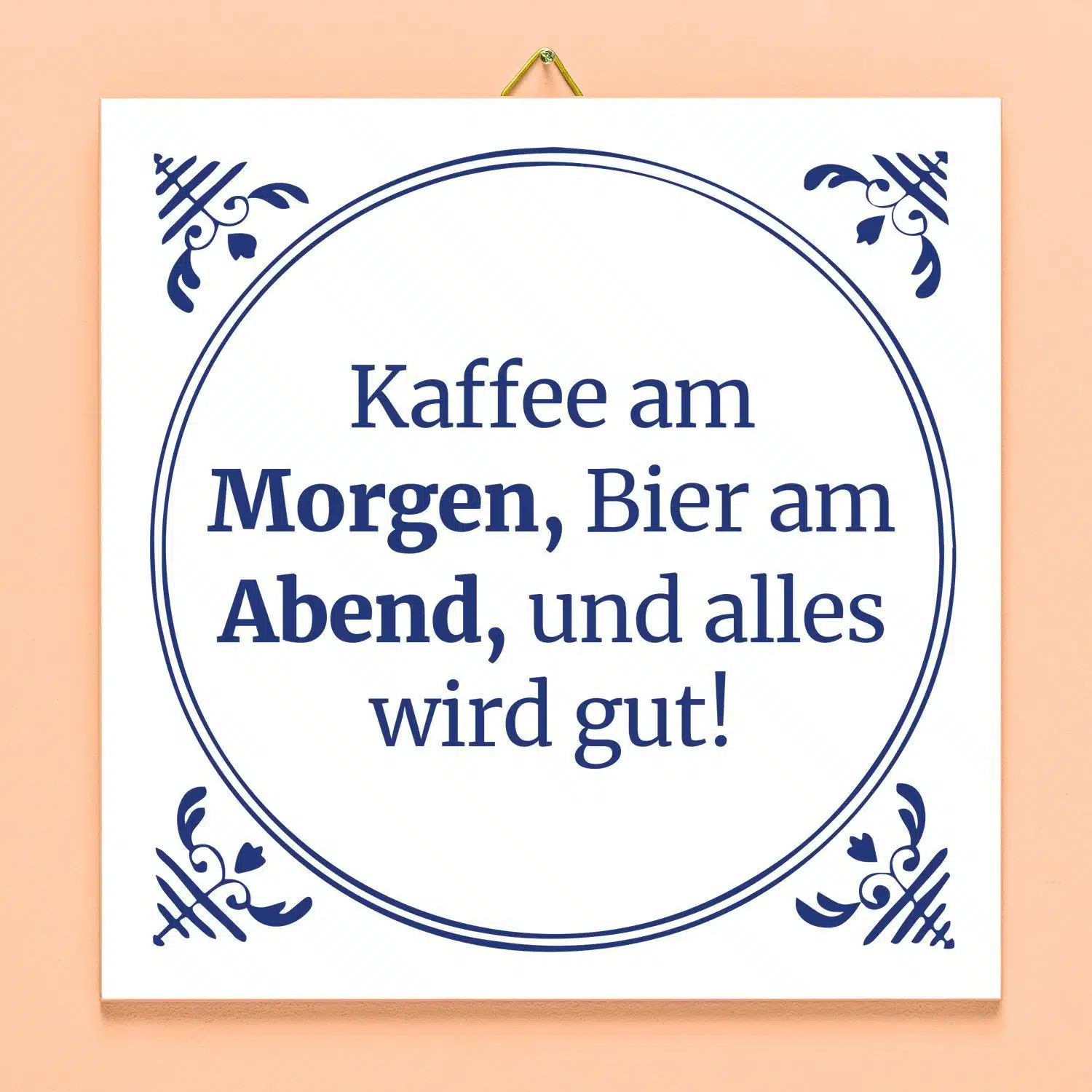 • Fliese mit dem Text: Kaffee am Morgen, Bier am Abend und alles wird gut!