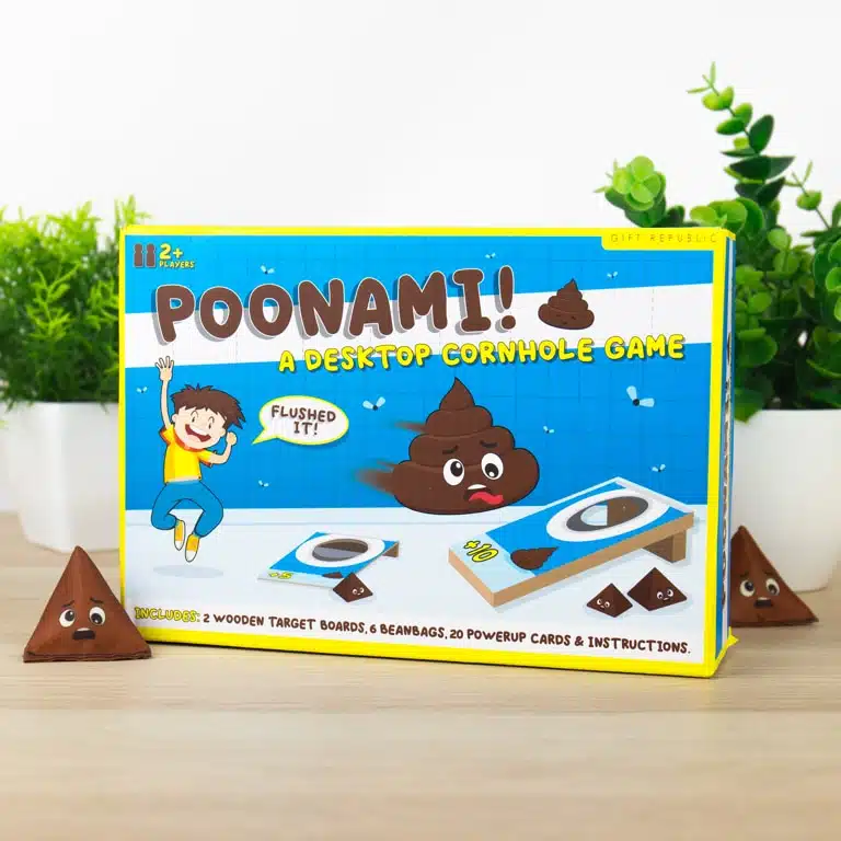 Das Kacke-Wurfspiel von Gift Republic ist ein urkomisches WC-Thema-Wurfspiel, bei dem du Kacke-Beanbags in Toiletten werfen musst. Mit 3 aufklappbaren Toiletten, 6 Kacke-Sรคckchen, 20 Aktionskarten und einer Sanduhr hast du alles fรผr chaotische Spielsessions. Sabotiere deine Freunde mit Aktionskarten, wirf mit verbundenen Augen oder race gegen die Uhr. Perfekt fรผr Familien, Kindergeburtstage oder einfach fรผr Erwachsene, die dumme Witze lieben. Gekicher garantiert!