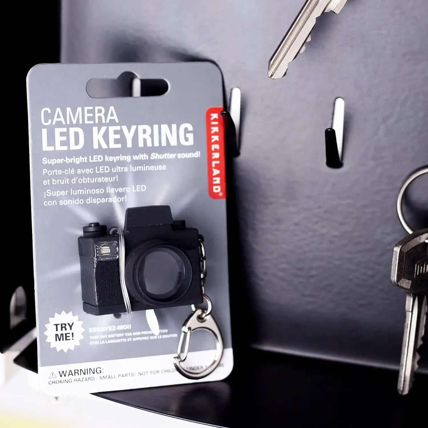 Machen Sie am liebsten den ganzen Tag Selfies und fangen Sie an zu lachen, sobald Sie eine Kamera sehen? Dann ist der Smile Camera Schlüsselanhänger von Kikkerland genau das Richtige für Sie. Dieser Schlüsselanhänger mit Kamera sieht aus wie ein professionelles Gerät, kann aber leider keine echten Fotos machen. Das können Sie vorgeben. Wenn Sie die Taste blitzen drücken, blitzt die Kamera auf und gibt ein Auslösegeräusch von sich. Auf diese Weise können Sie das Schlüsselloch im Dunkeln leicht finden.