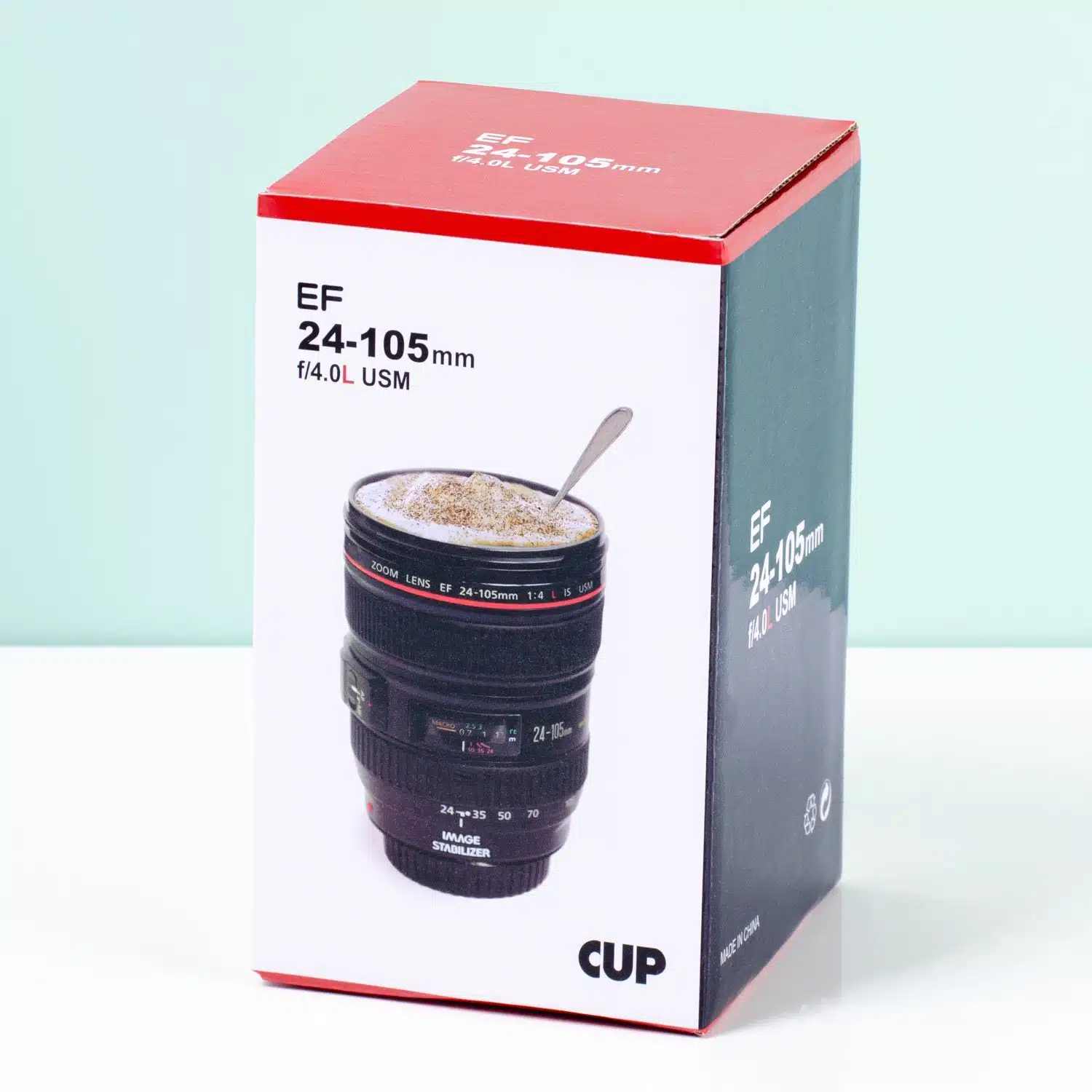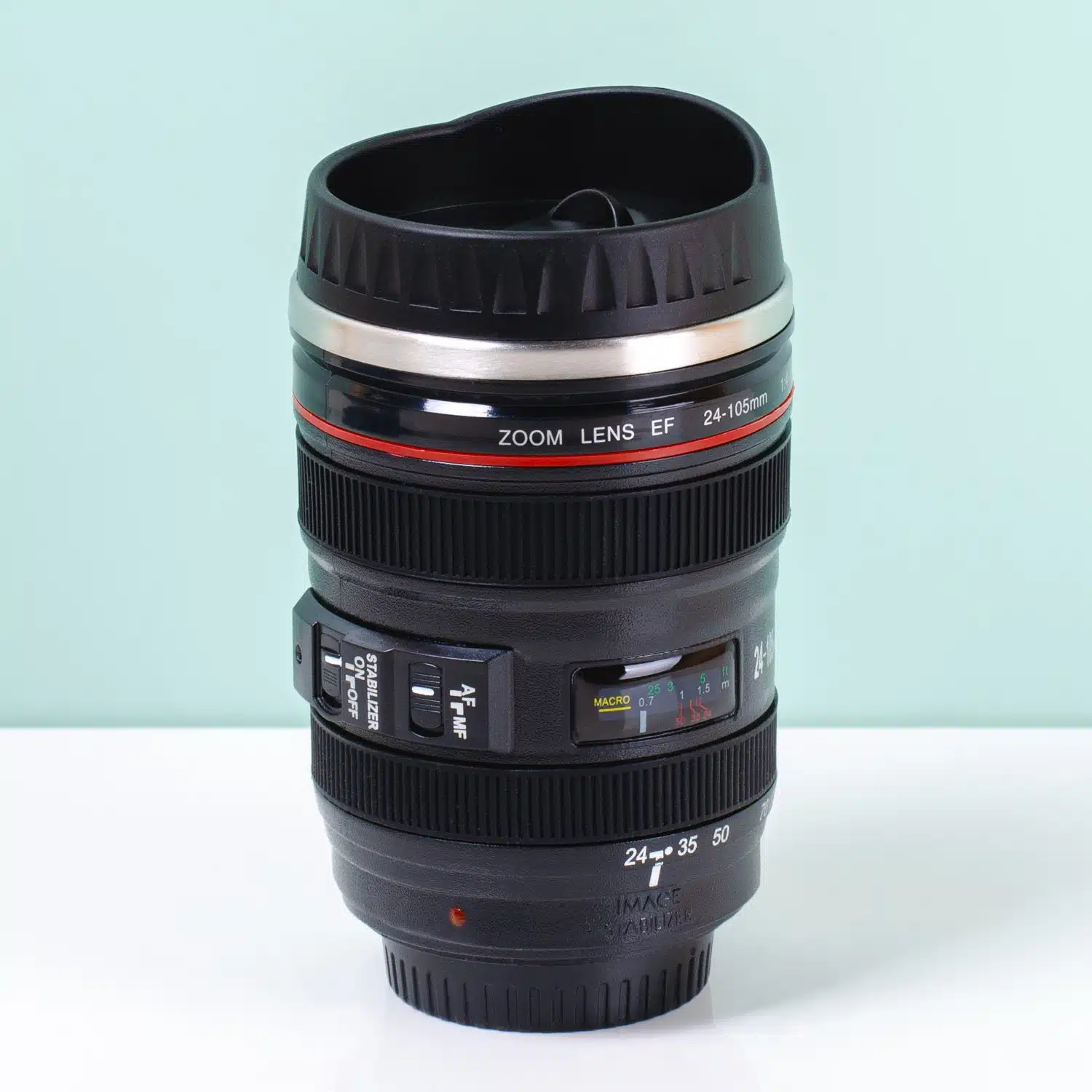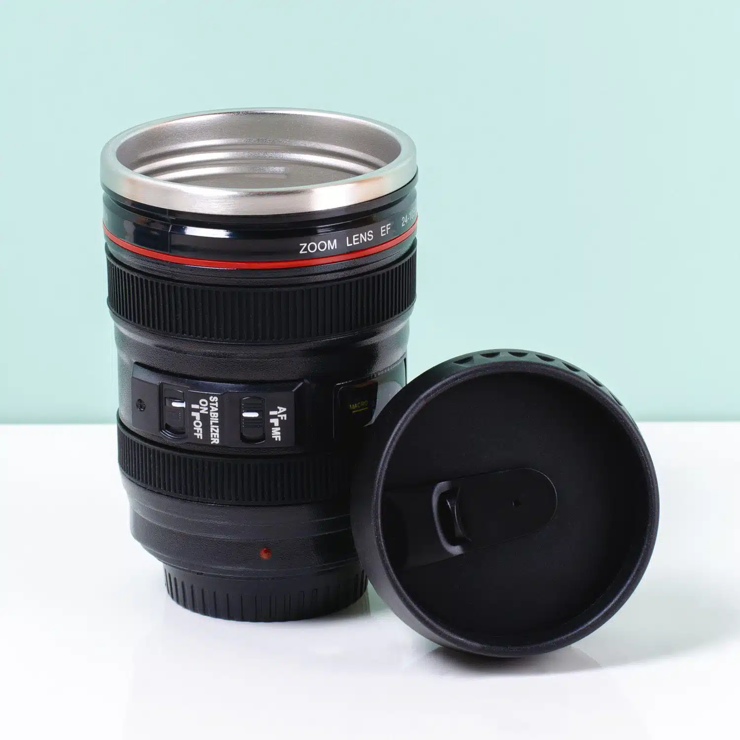 Ab sofort können Sie Ihren Kaffee mit einem strahlenden Lächeln trinken. Sie wissen nie, wann Sie fotografiert werden. Die Camera Lens Tasse ist die beste Tasse für Models und Fotografen. Diese Tasse sieht aus wie eine EF24-105 Millimeter Linse. Sie macht keine Fotos, aber sie ist perfekt geeignet, um Kaffee und Tee zu trinken. Sie haben einen Freund, der gerne fotografiert und suchen noch ein schönes Geburtstagsgeschenk für ihn? Schenken Sie ihm den Kameraobjektivbecher! Der Becher hat einen Deckel mit Schraubverschluss.