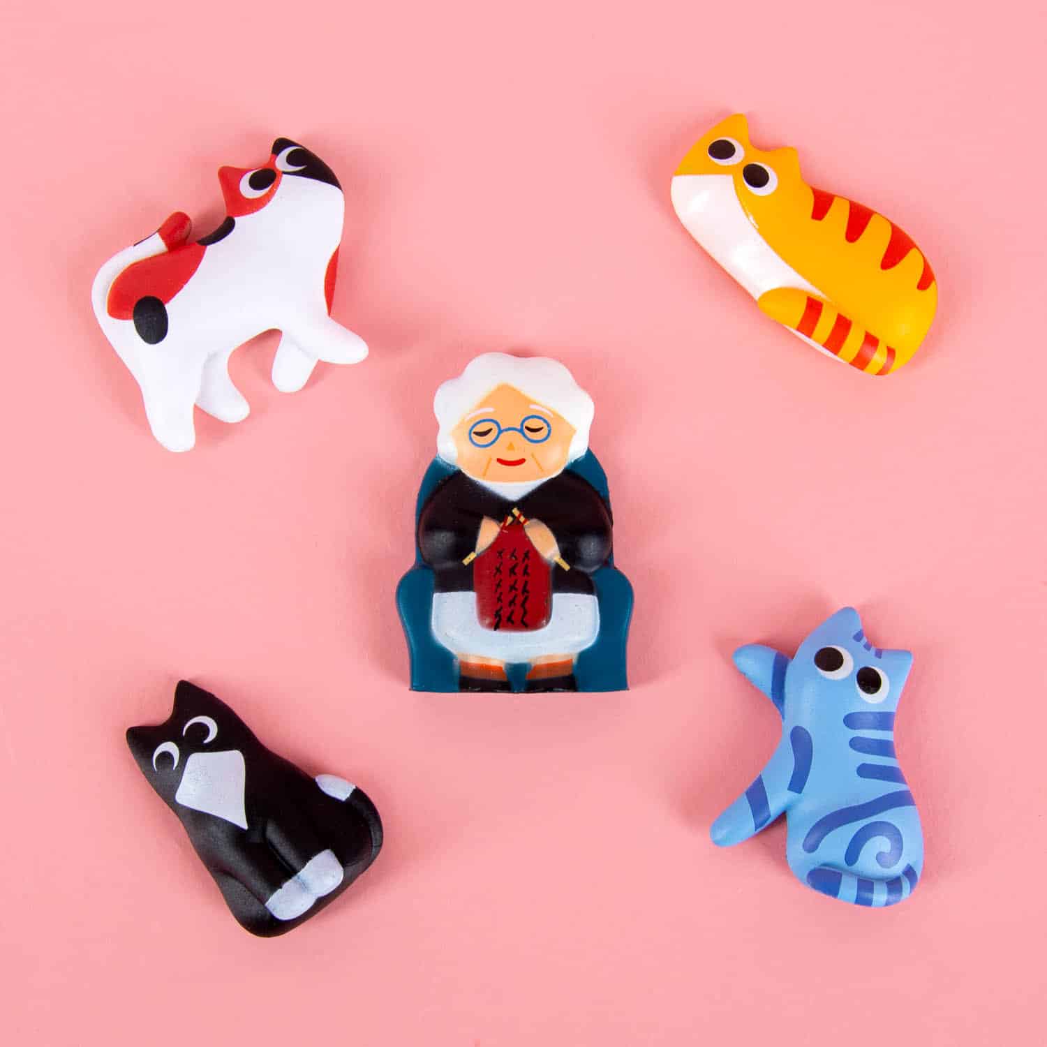 • Set aus fünf Magneten: eine strickende Oma und vier Katzen