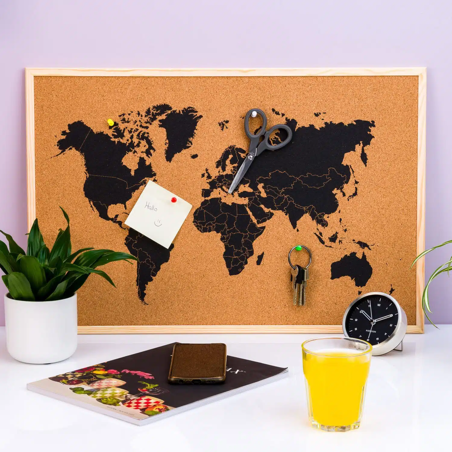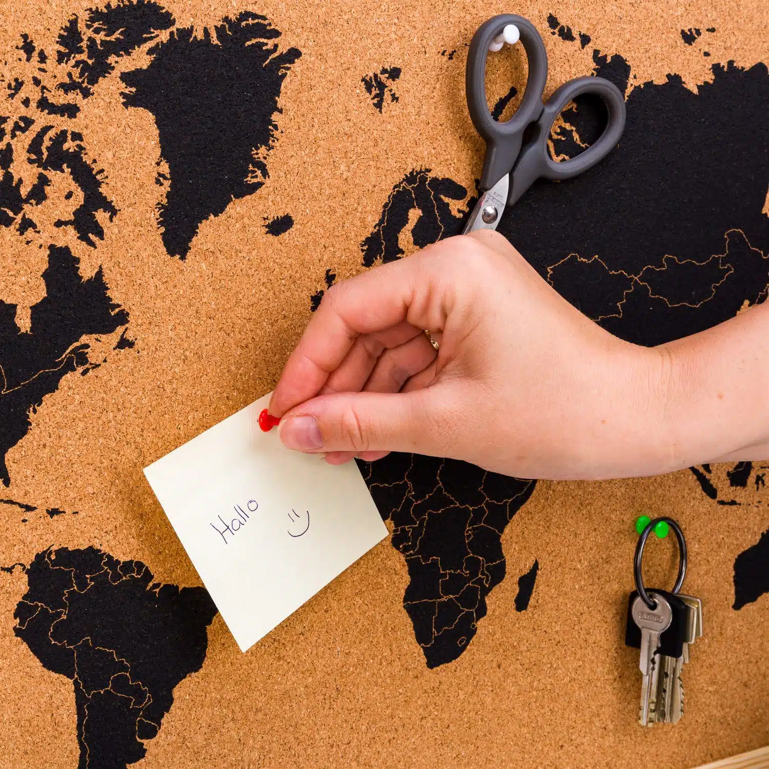 Bewahren Sie immer noch Eintrittskarten auf, wenn Sie im Urlaub waren? Schwören Sie auf Einkaufszettel und lassen Sie Ihre Fotos auch ausdrucken? Dann ist die Kork-Pinnwand mit Weltkarte wie für Sie gemacht. Auf diesem Kork-Pinnwand – mit aufgedruckter Weltkarte – können Sie all Ihre Souvenirs aufhängen. Super geeignet für Eintrittskarten, Urlaubsfotos und andere Andenken!