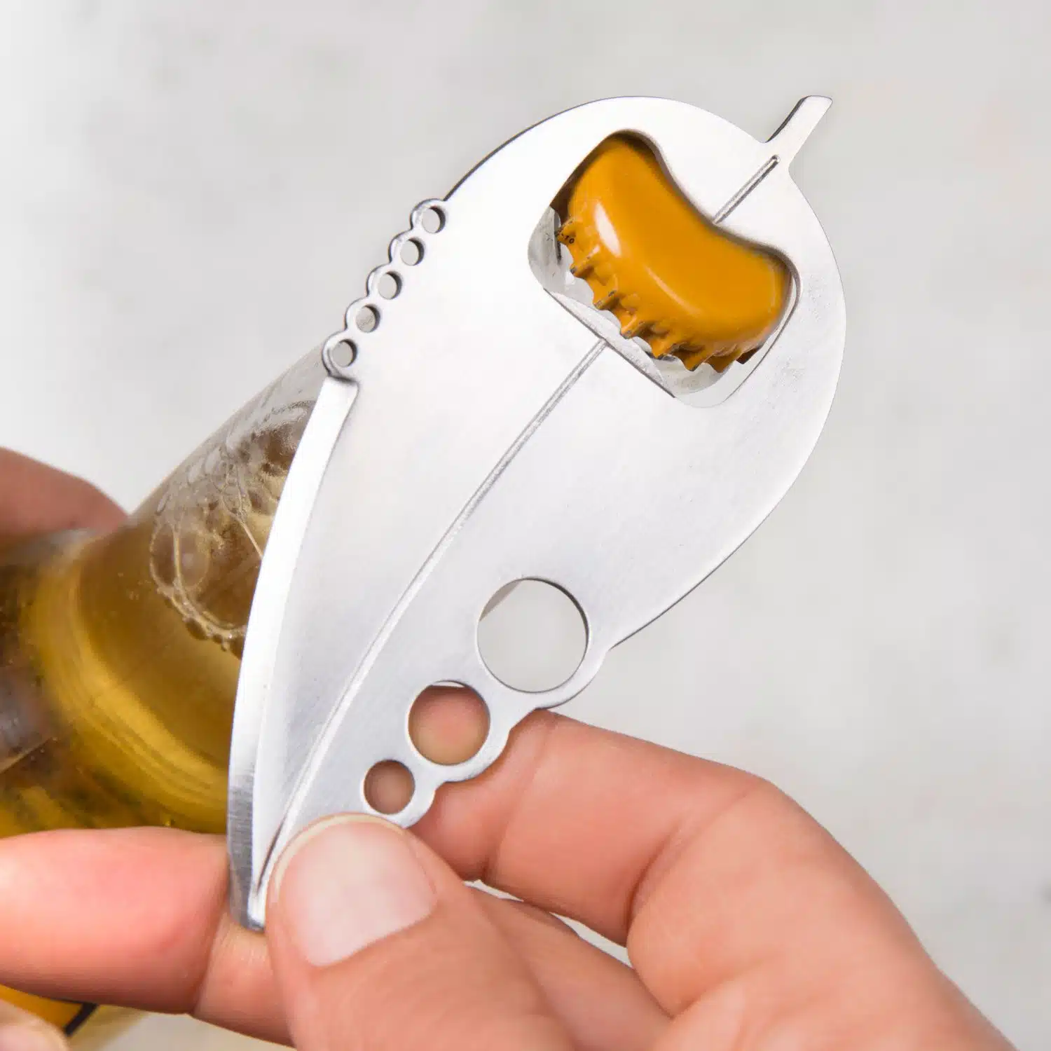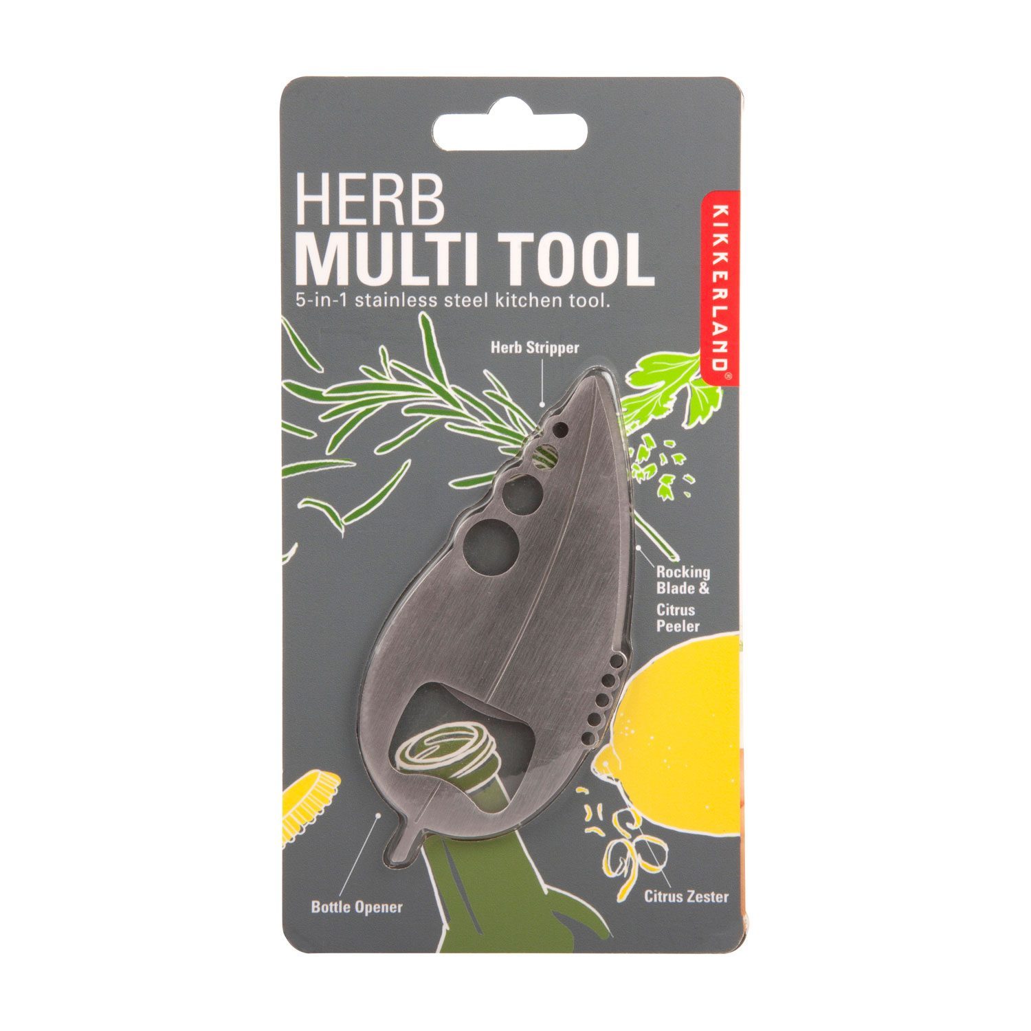 Stellen Sie sich vor, Sie bereiten einen köstlichen Eintopf oder ein Ofengericht zu. Dann ist es wichtig, das Gericht gut zu würzen. Das Kräuter-Multitool von Kikkerland hilft Ihnen dabei. Dieses praktische Multitool in Form eines Blattes kann öffnen, schälen, schneiden und würzen. Brauchen Sie etwas Zitronenschale? Verwenden Sie dann die fünf scharfen Löcher, um die Schale zu schälen. Mit einem der vier Löcher auf der anderen Seite des Blatt-Multitools können Sie ganz einfach Thymian und Rosmarin vom Zweig entfernen. Natürlich können Sie mit dem Messer problemlos Früchte schneiden und schälen. Schließlich hat das Edelstahl-Multitool einen Flaschenöffner, denn Bier schmeckt einfach köstlich in einem Eintopf. Oder Sie gießen es einfach direkt in den Mund, das geht auch.