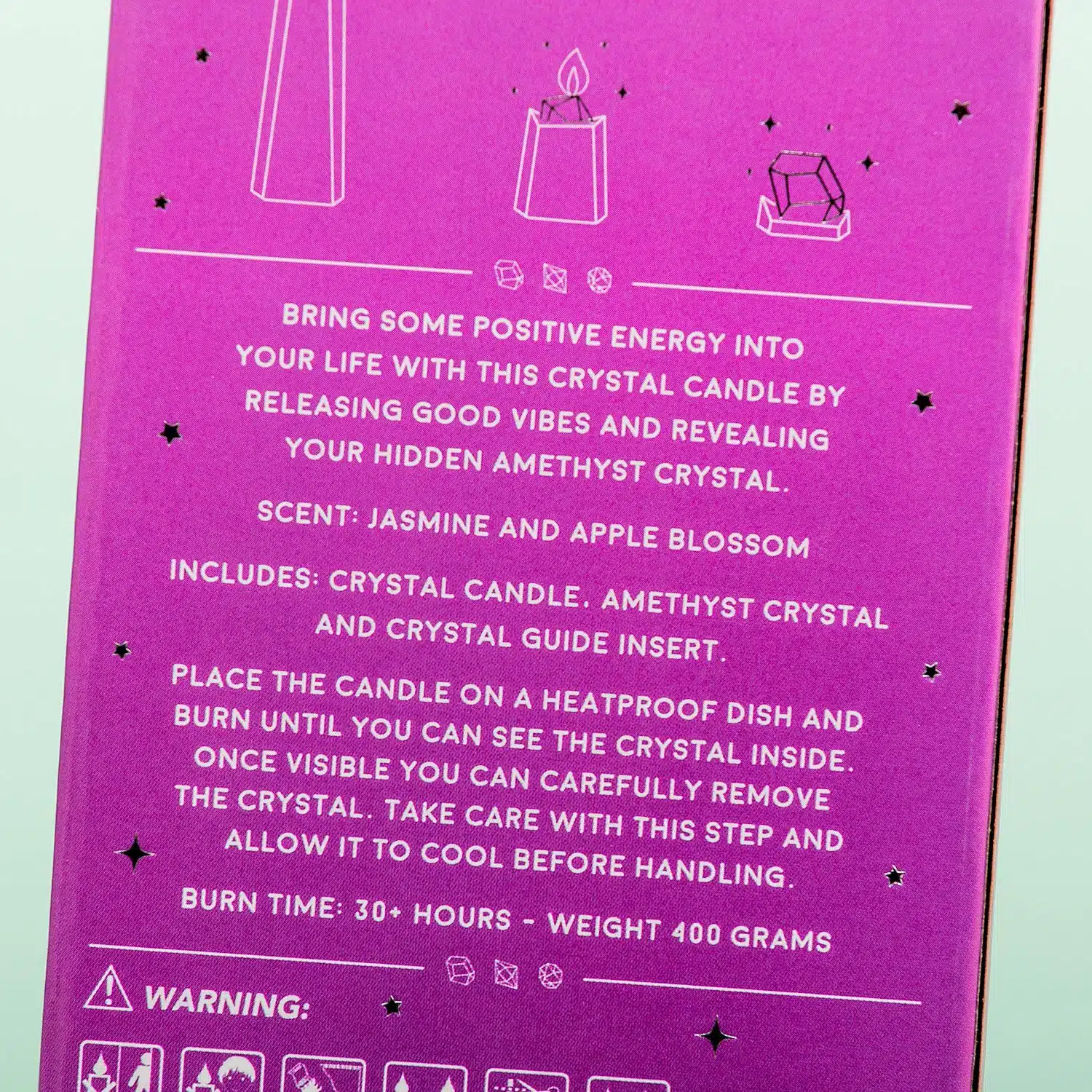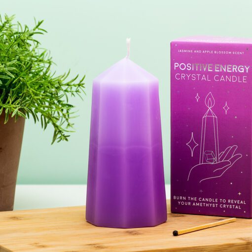 Können Sie etwas positive Energie gebrauchen? Sie haben sich schon immer für die Kraft der Kristalle interessiert? Die kristallförmige Kerze mit Amethyst von Gift Republic ist wirklich etwas für Sie. Diese violette Kerze in Form eines Kristalls ist nicht nur schön,außerdem duftet es wunderbar nach Jasmin und Apfelblüte. Und wenn Sie es verbrennen, finden Sie mit der Zeit einen echten Amethyst, der in der Kerze versteckt ist. Mit dem beiliegenden Informationsheft können Sie nachlesen, wie Amethyst positiv auf Sie wirken kann.