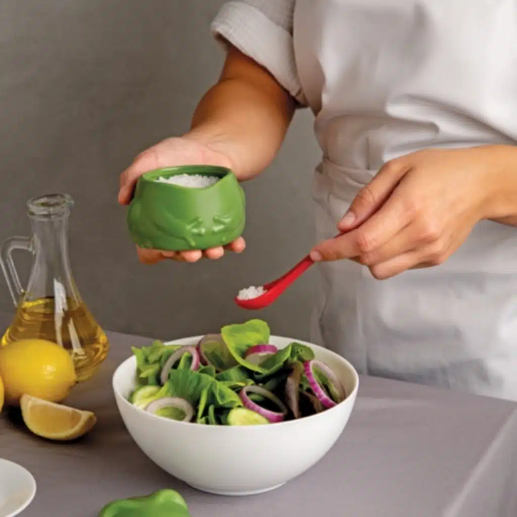 Spring in den Geschmack mit Lily! Dieser Salztopf in Form eines Frosches hat einen roten Löffel, der wie eine ausgestreckte Zunge aussieht – perfekt um Salz, Zucker oder Gewürze zu streuen. Ein tolles Geschenk für Kochliebhaber!