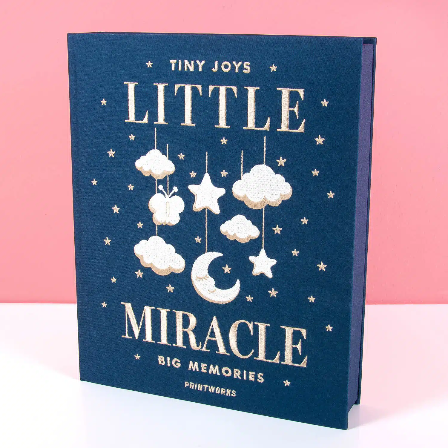 Das erste Jahr eines Babys vergeht schneller als man denkt. Das erste Lรคcheln, die ersten Schritte, das erste Mal, dass sie deinen Namen sagen: All diese kleinen Wunder verdienen einen Platz, der sie niemals vergisst. Das Little Miracle Fotoalbum von Printworks ist ein luxuriรถses Coffeetable-Buch mit einem dunkelblauem Einband, verziert mit goldenen Wรถlkchen und goldener Stickerei. Dreiรig Seiten warten auf die schรถnsten Momente des ersten Kapitels โ erweiterbar auf vierzig, falls das erste Jahr noch mehr magische Momente bringt als erwartet.