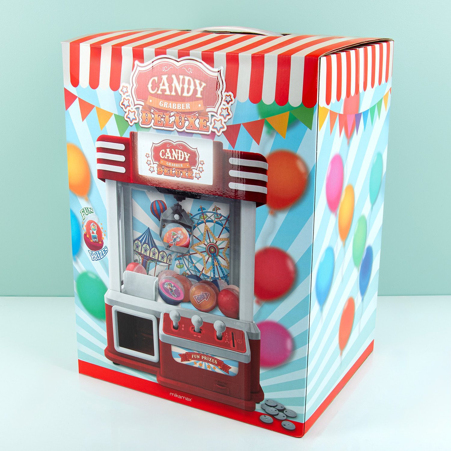 Ist der Greifautomat dein Favorit auf der Kirmes? Ab jetzt kannst du zu Hause üben mit dem Luxus-Süßigkeiten-Greifautomat von MikaMax, damit du auf der Kirmes davon profitieren kannst. Diesen Greifautomaten füllst du mit den Preisbällen und Süßigkeiten. Dann wirfst du eine Münze in das Gerät und kannst deine Fähigkeiten üben. Bei der Süßigkeitenmaschine sind sechzehn Kärtchen dabei, die du in die Preisbälle stecken kannst. Außerdem kannst du zum Beispiel Toffees in die Maschine legen.
