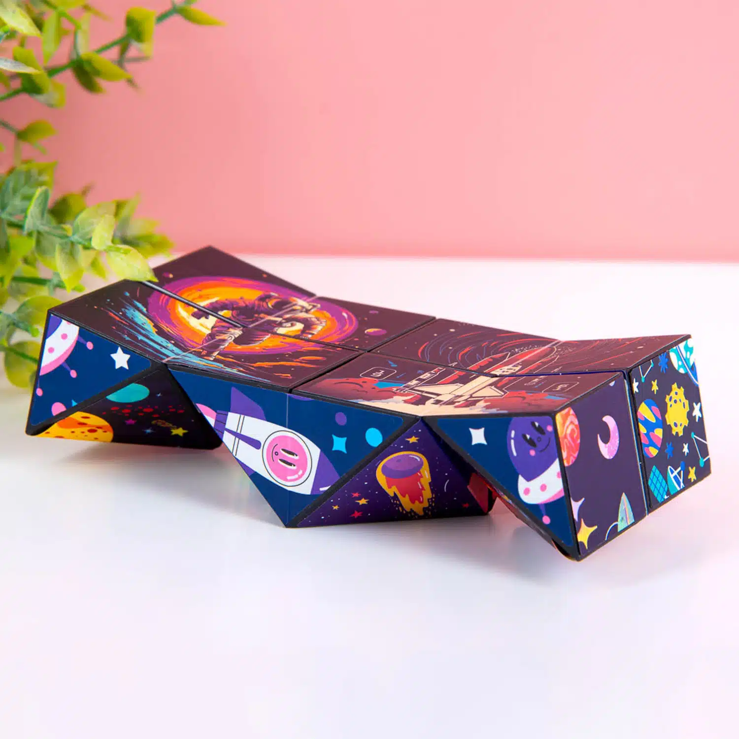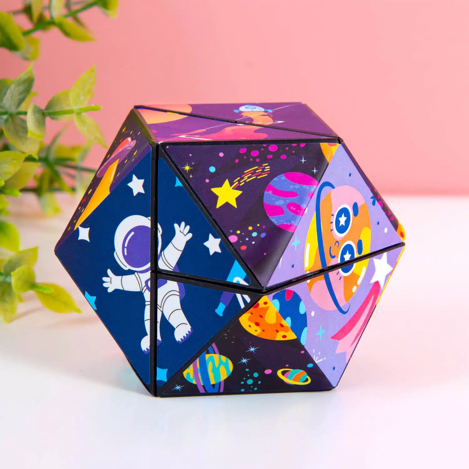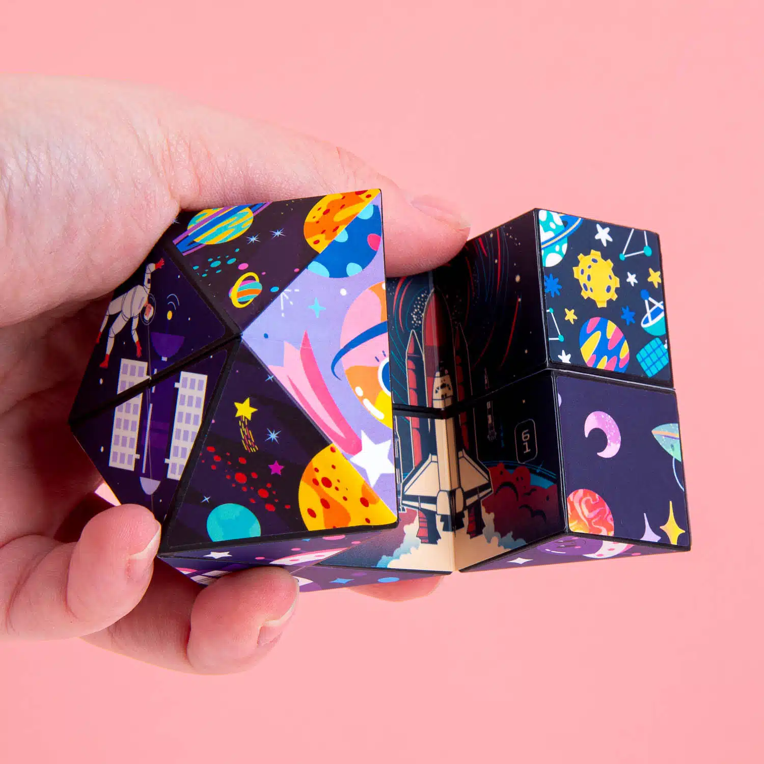 Der Magische Weltraumwürfel kennt keine Grenzen! Diese faszinierende Puzzlewürfel lässt sich auf viele verschiedene Arten zusammensetzen. Ob als Würfel, Rechteck, Stern oder eine abstrakte Form – alles ist möglich. Dabei entstehen immer wieder neue Muster mit einem tollen Weltraumdesign. Dieser kreative Würfel sorgt für stundenlangen Spielspaß!
