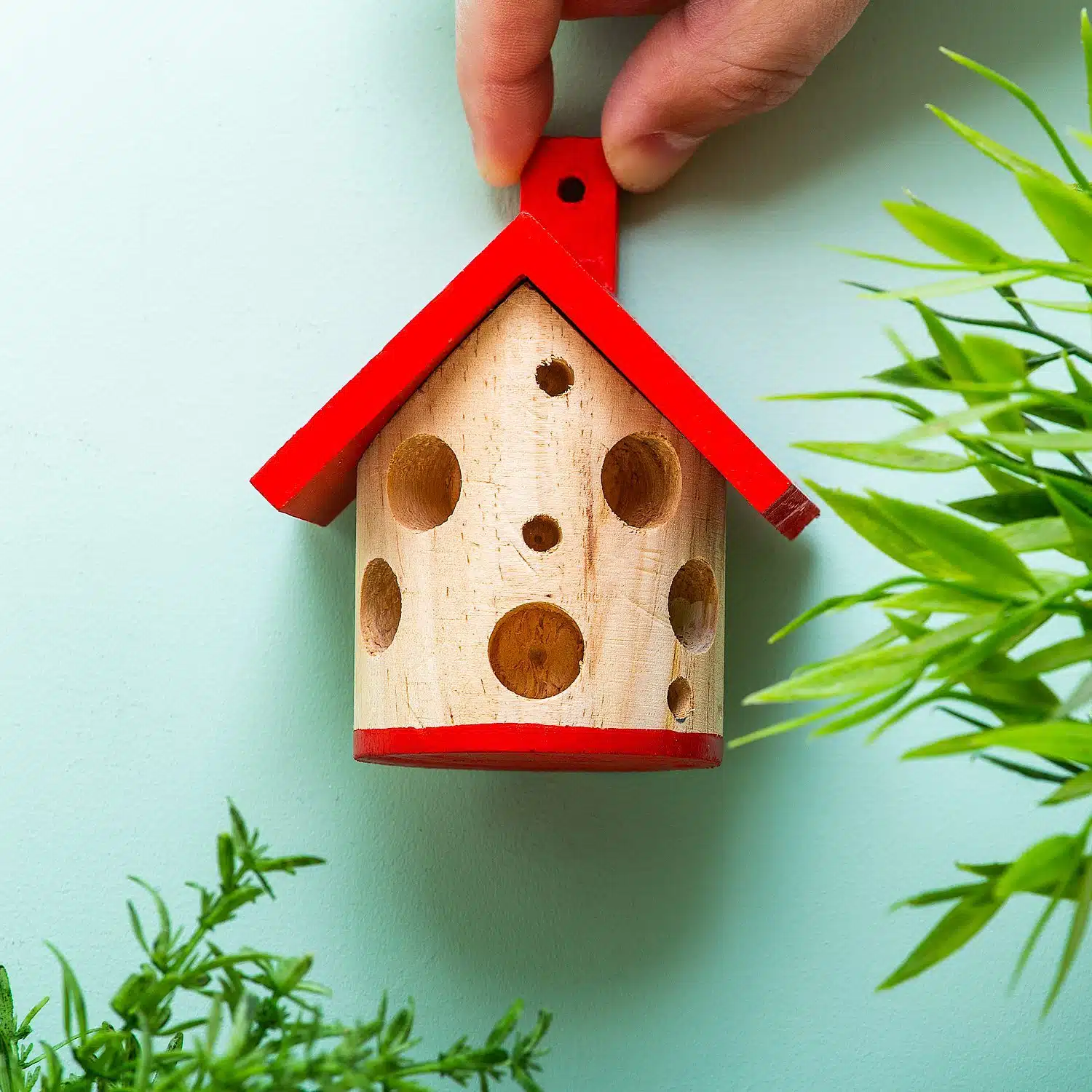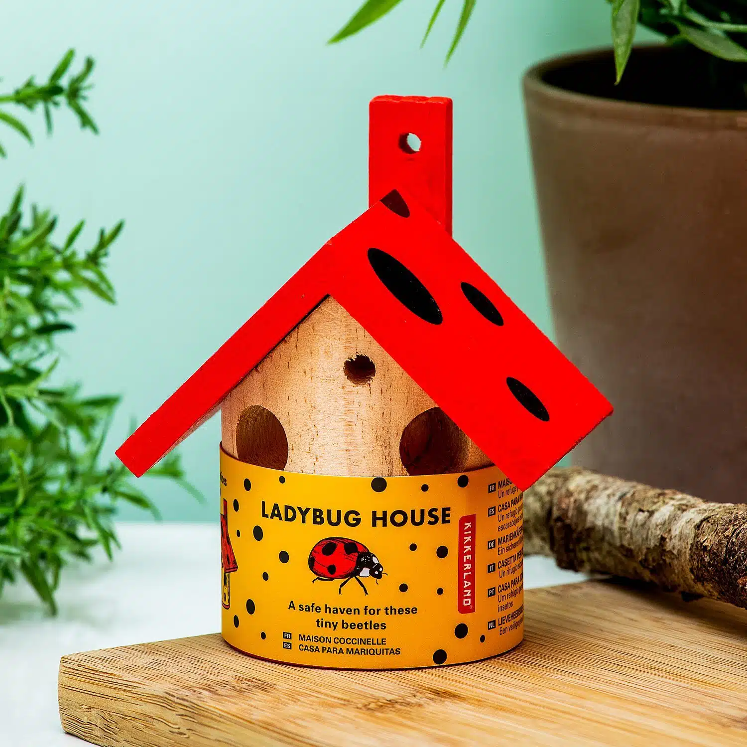 Eine sichere Zuflucht für Marienkäfer: Manchmal mangelt es in Gärten mit hauptsächlich Fliesen daran. Das Marienkäferhaus von Kikkerland bietet ihnen einen sicheren Ort zum Nisten. Das kleine Marienkäferhotel ist aus Holz gefertigt und hat verschiedene Öffnungen. Das rote Dach macht es besonders niedlich. Hängen Sie es an einen Baumstamm oder an Ihren Zaun und tragen Sie so zu einer besseren Lebensumgebung für Marienkäfer bei.