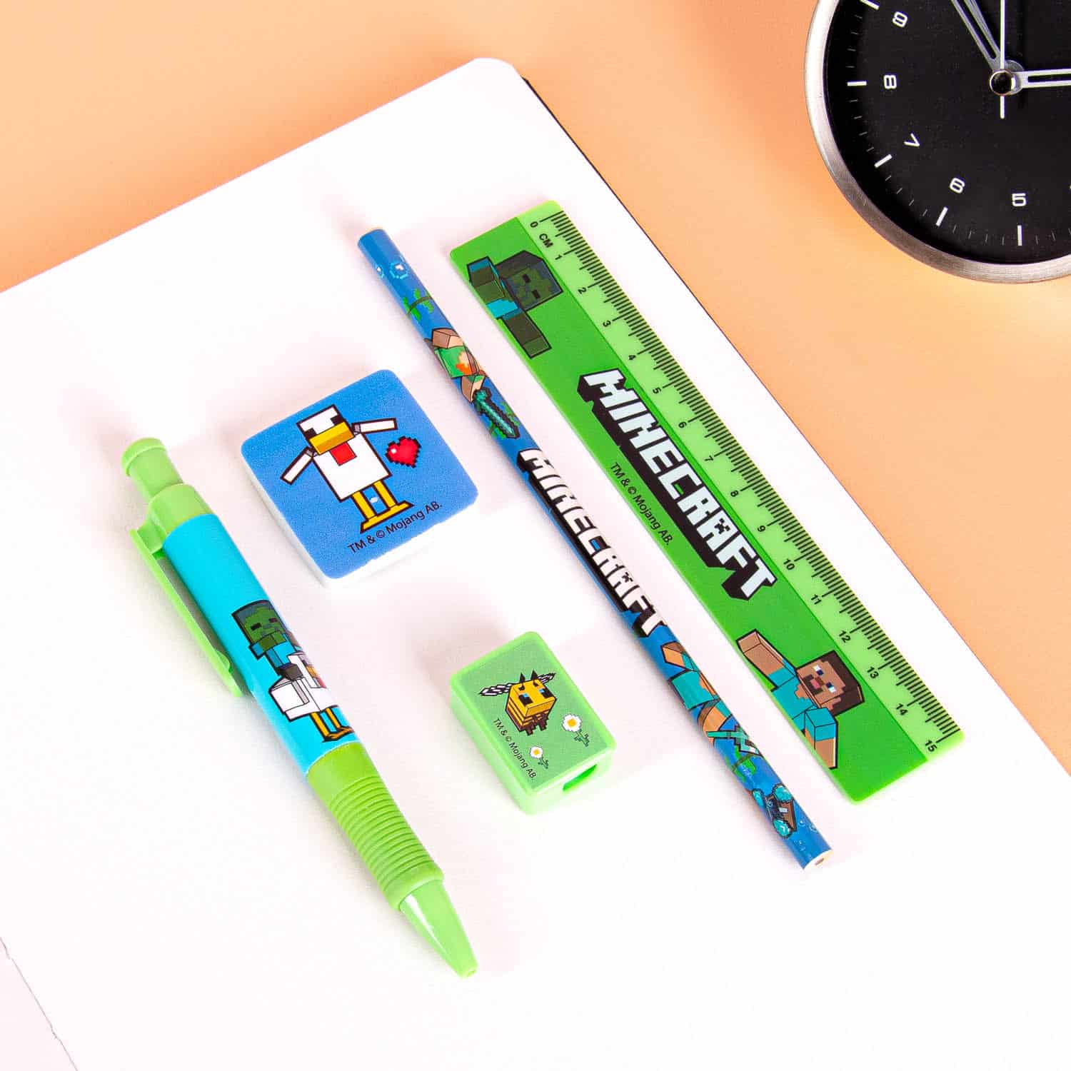 Wenn du auch in der Schule lieber weiterspielen wรผrdest โ dann geht das, zumindest ein bisschen, mit diesem lustigen Minecraft Schreibset. Enthalten sind ein Bleistift, Kugelschreiber, Radiergummi, Lineal und Anspitzer im Minecraft-Design.