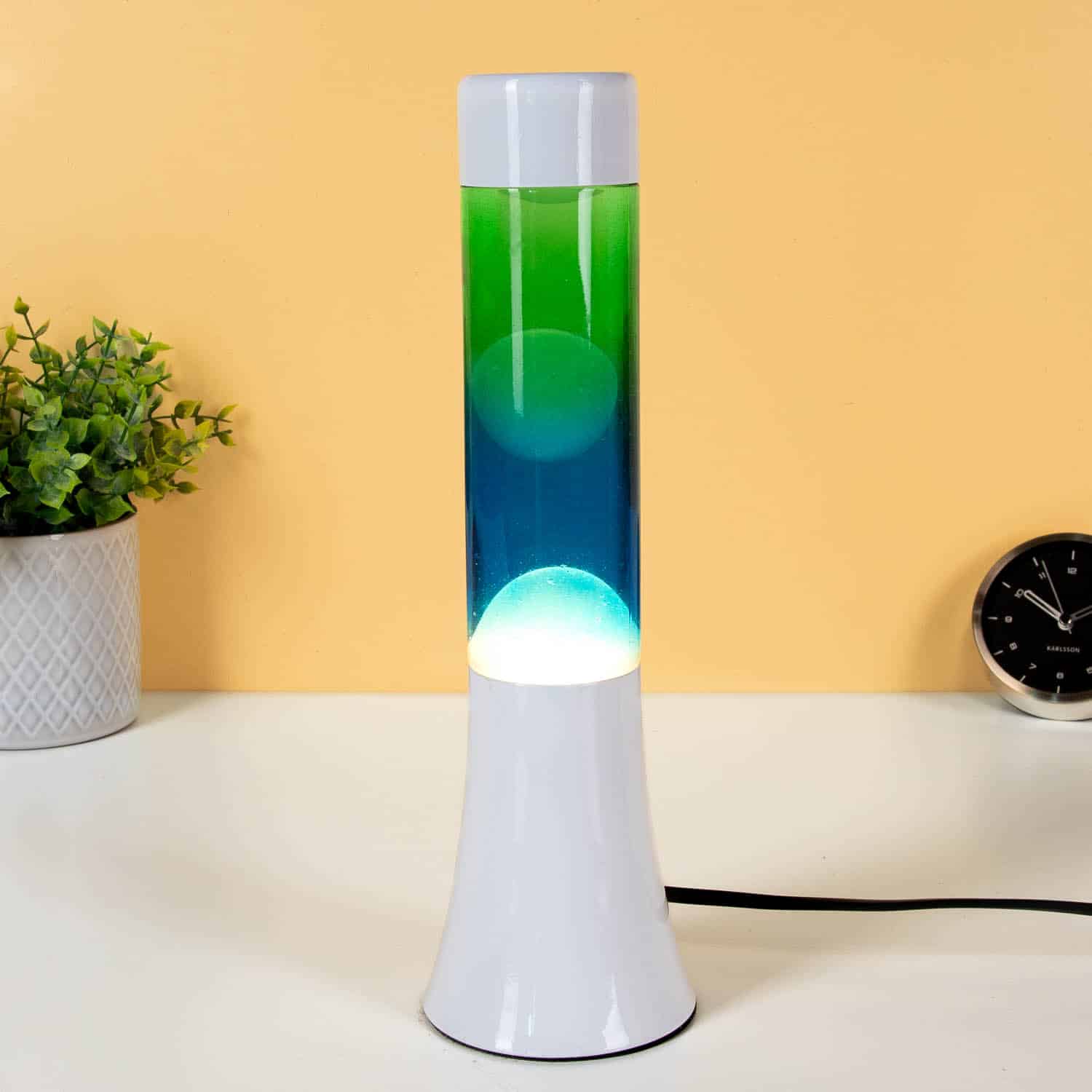 Grüne und blaue Lavalampe mit weißem Sockel von Fisura
