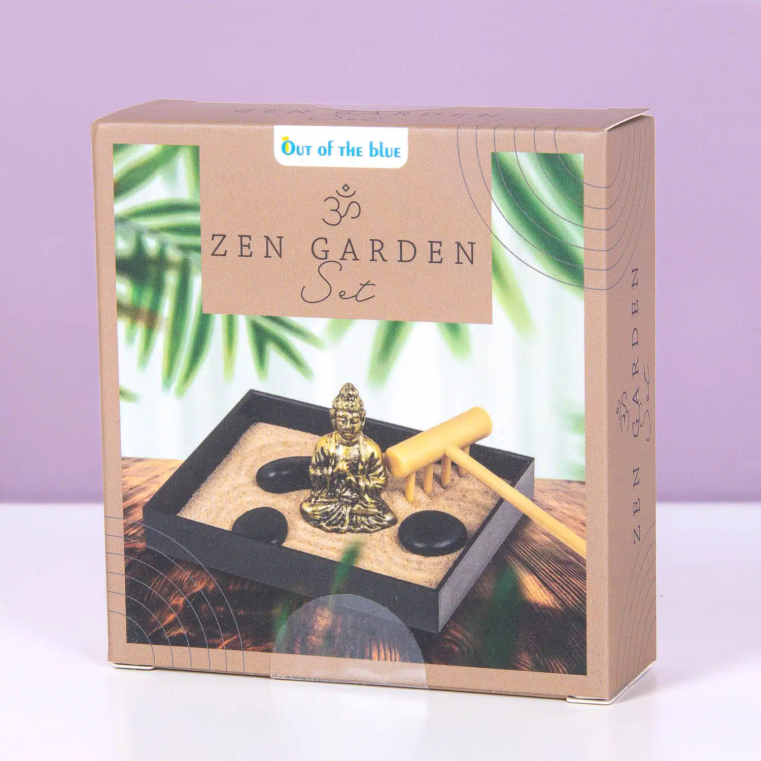 Stress auf der Arbeit? Stressigen Tag gehabt? Dieser Mini Zen-Garten mit Buddha bringt instant Zen auf deinen Schreibtisch. Mit seiner Kunststoffschale (9 x 7,5 cm), Buddha-Figur, Steinchen, Sand und Harke kannst du deinen eigenen Mini-Zen-Moment kreieren. Harke durch den Sand, lege die Steinchen um, atme aus – und fühle die Ruhe. Perfekt für deinen Schreibtisch, Nachttisch oder wo immer du einen Moment Peace brauchst. Kommt in einer Geschenkbox!