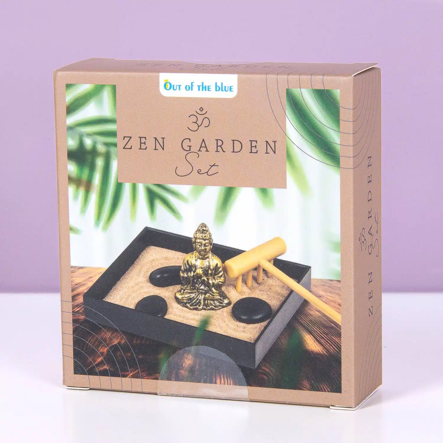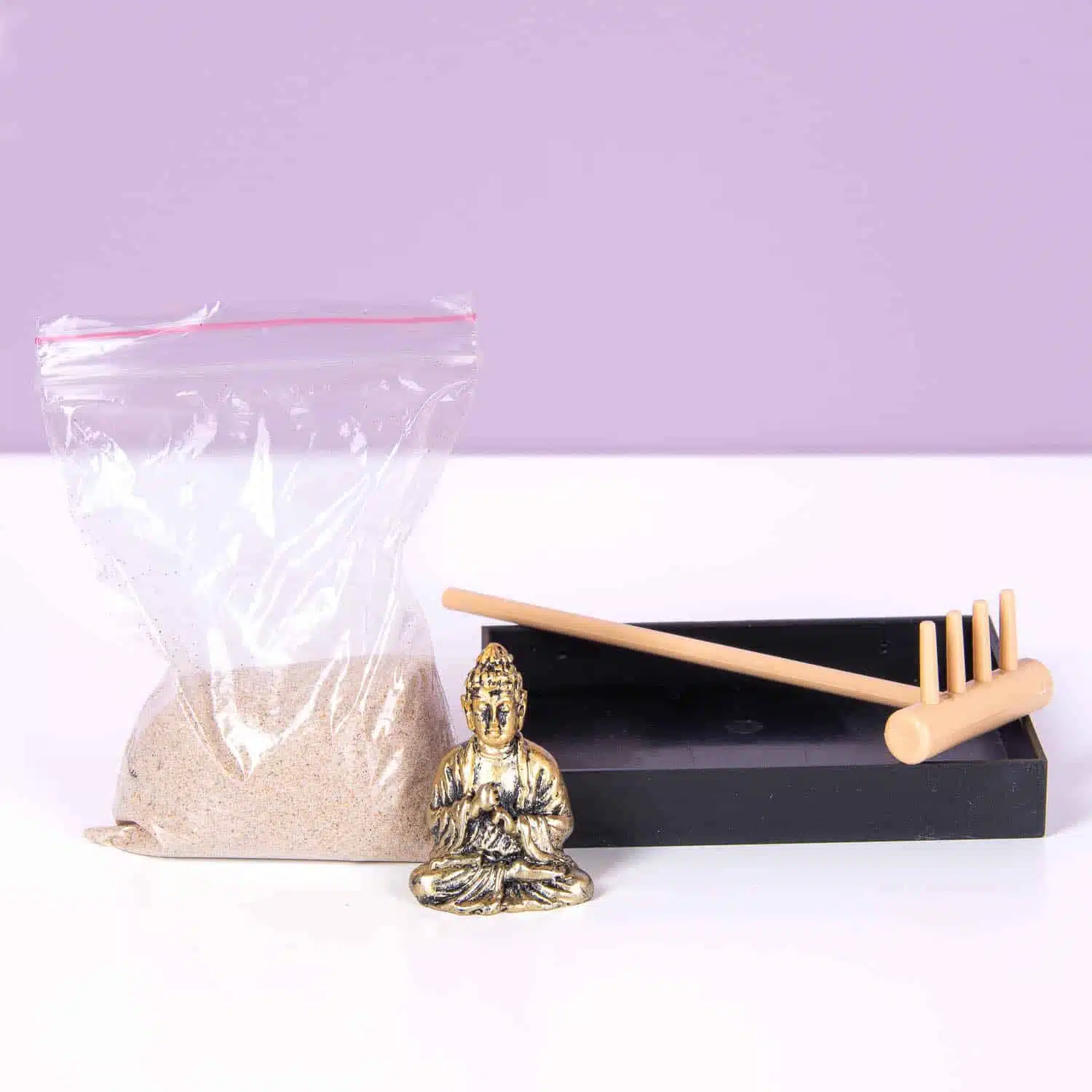 Stress auf der Arbeit? Stressigen Tag gehabt? Dieser Mini Zen-Garten mit Buddha bringt instant Zen auf deinen Schreibtisch. Mit seiner Kunststoffschale (9 x 7,5 cm), Buddha-Figur, Steinchen, Sand und Harke kannst du deinen eigenen Mini-Zen-Moment kreieren. Harke durch den Sand, lege die Steinchen um, atme aus – und fรผhle die Ruhe. Perfekt fรผr deinen Schreibtisch, Nachttisch oder wo immer du einen Moment Peace brauchst. Kommt in einer Geschenkbox!