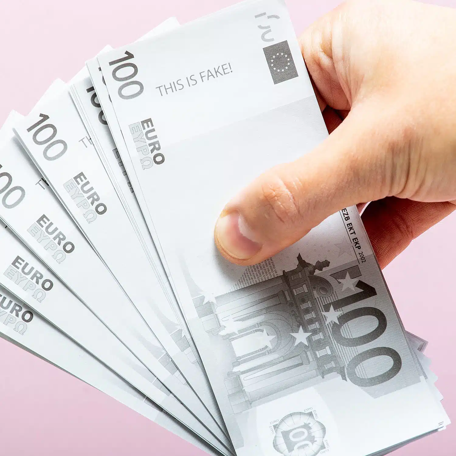 - Kommt mit gefälschten Geldscheinen (Euro)