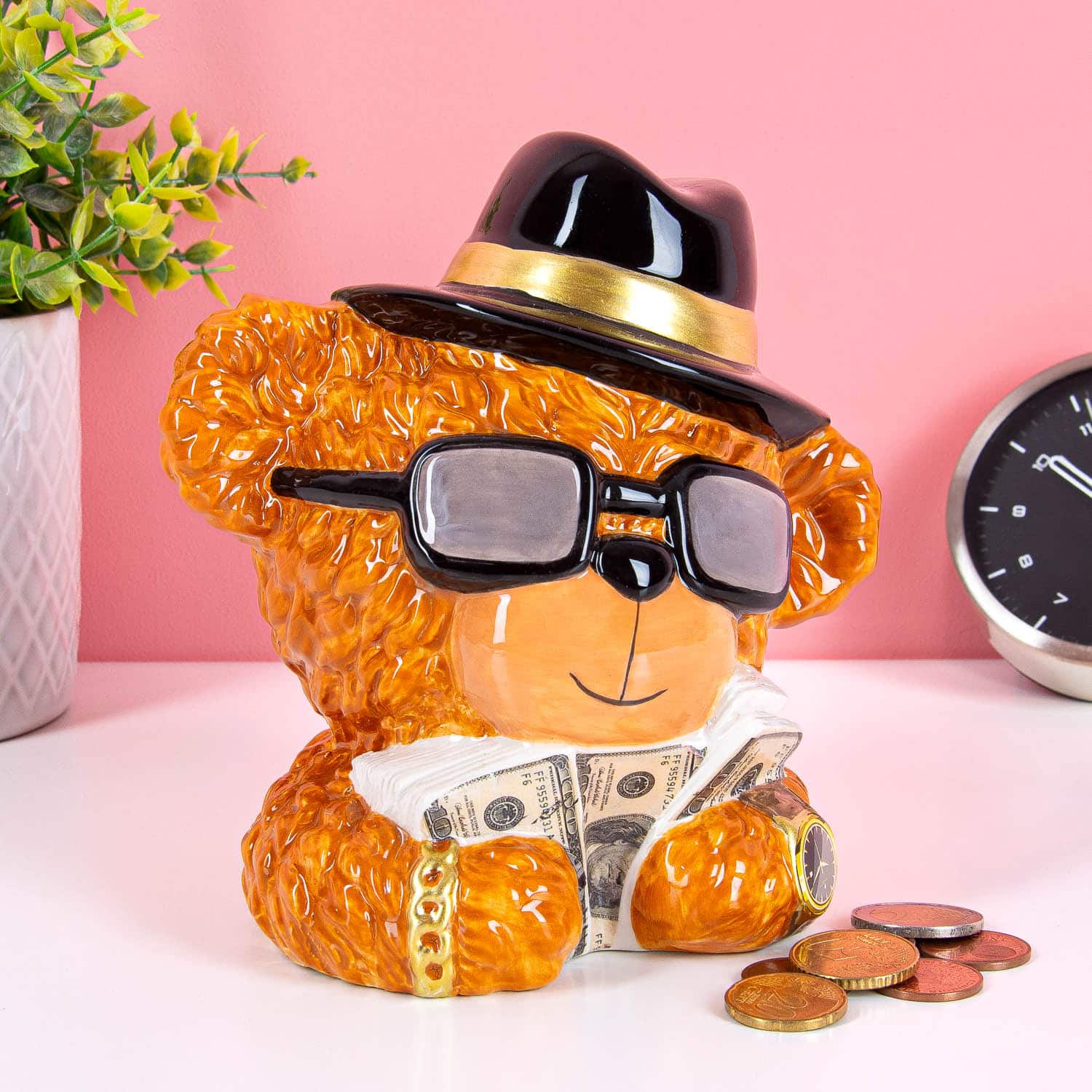 Warum einfach sparen, wenn es auch mit Swag geht? Mr. Money ist eine Spardose in Form eines pimpigen Bรคren, der dir hilft, dein Geld aufzubewahren. Mit seinem coolen Look und Schloss unten kannst du dein Spargeld sicher aufbewahren, ohne ihn kaputtmachen zu mรผssen. Perfekt fรผr jeden, der sein Spargeld mit Stil aufbewahren will!