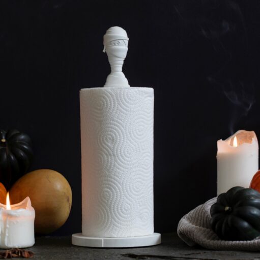 Lerne den Mumien Küchenrollenhalter von Peleg Design kennen: den Küchenrollenhalter mit einem eingewickelten Mumienkopf obendrauf! Jedes Mal, wenn du ein Blatt abreißt, wickelst du die Mumie langsam aus. Perfekt für Halloween… oder eigentlich das ganze Jahr über, wenn du Spooky Vibes liebst. Ein lustiges Geschenk für Menschen, die ihre Küche gruseliger machen wollen!