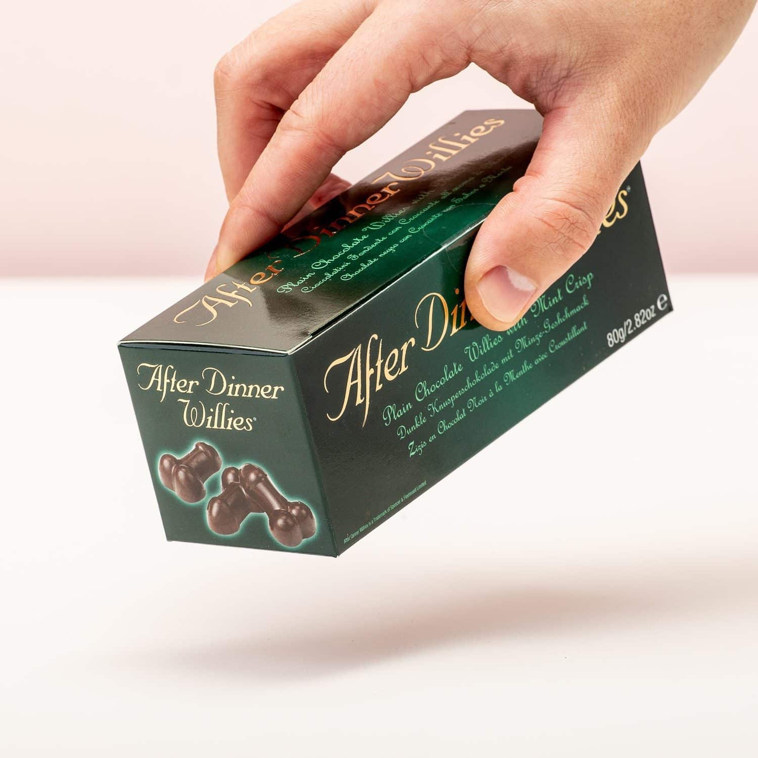 Eine After-Dinner-Schokolade, wie die mit Minzfondant gefรผllte. Freuen Sie sich darรผber auch immer? Wir haben genau das Richtige fรผr Sie! Die After Dinner Willies verleihen diesem kรถstlichen Dessert eine freche Note. Sie haben die Form eines Penis mit Eiern. Ein lustiges Geschenk zum Mitnehmen, wenn Sie zu jemandem zum Abendessen eingeladen sind. Kรถnnen Sie sich den Blick Ihrer Gastgeber vorstellen, wenn sie die Schachtel รถffnen? Die Schachtel enthรคlt acht Schokoladen-Dicks mit Minzfondant.