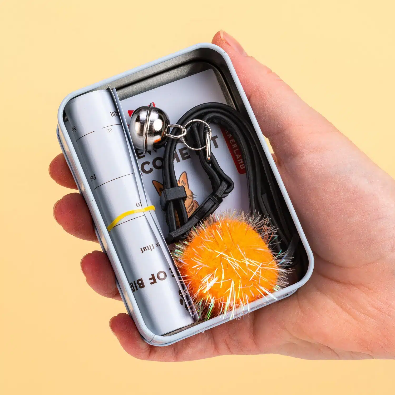Bevor du eine neue Katze nach Hause bringst, hast du natรผrlich schon viel recherchiert. Du hast ein gemรผtliches Kรถrbchen und auch die Spielzeuge sind bereit. Mit dem Neues Katzen Willkommensset von Kikkerland sicherst du auch schnell einige praktische Dinge. In dieser sรผรen Blechdose befindet sich ein Halsband mit Glรถckchen, ein Spielball, zwei Zertifikate (fรผr Geburt und Adoption) und eine Anleitung mit Dingen, die du beachten solltest.