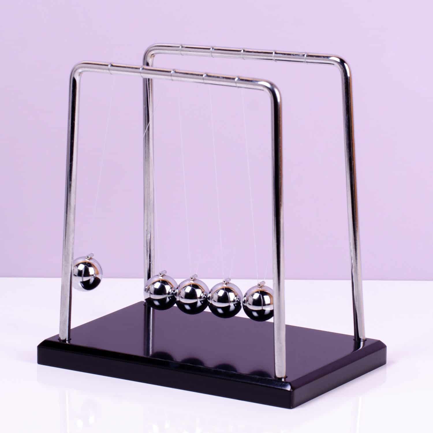 Wenn du wirklich erwachsen wirken mรถchtest, stellst du die Newtonpendel von MikaMax auf deinen Schreibtisch. Diese Pendel – oder Newtonโs Cradle – demonstriert das dritte Gesetz von Isaac Newton. Du weiรt schon, der Wissenschaftler, der die Schwerkraft beschrieben hat. Die Newtonpendel zeigt, wie Energie durch die Kugeln รผbertragen wird: Wenn du die linke Kugel gegen die nรคchste fallen lรคsst, bewegen sich die drei in der Mitte nicht. Erst die rechte Kugel wird sich bewegen. Dies geht so lange weiter, bis die Kugeln durch die Luftreibung immer weniger schwingen.