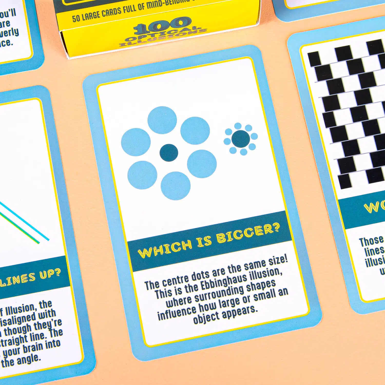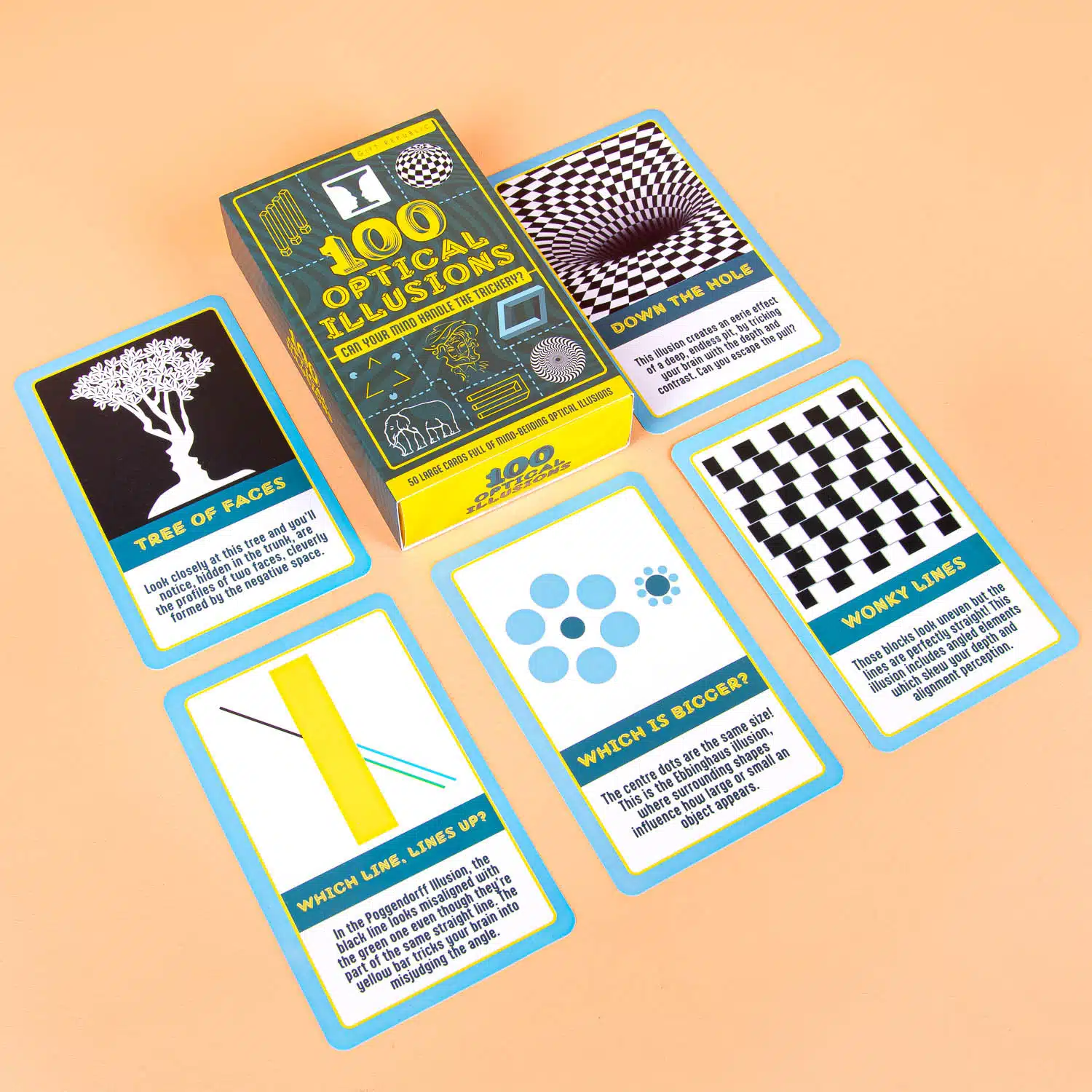 - Set van 50 dubbelzijdige kaarten met 100 optische illusies.