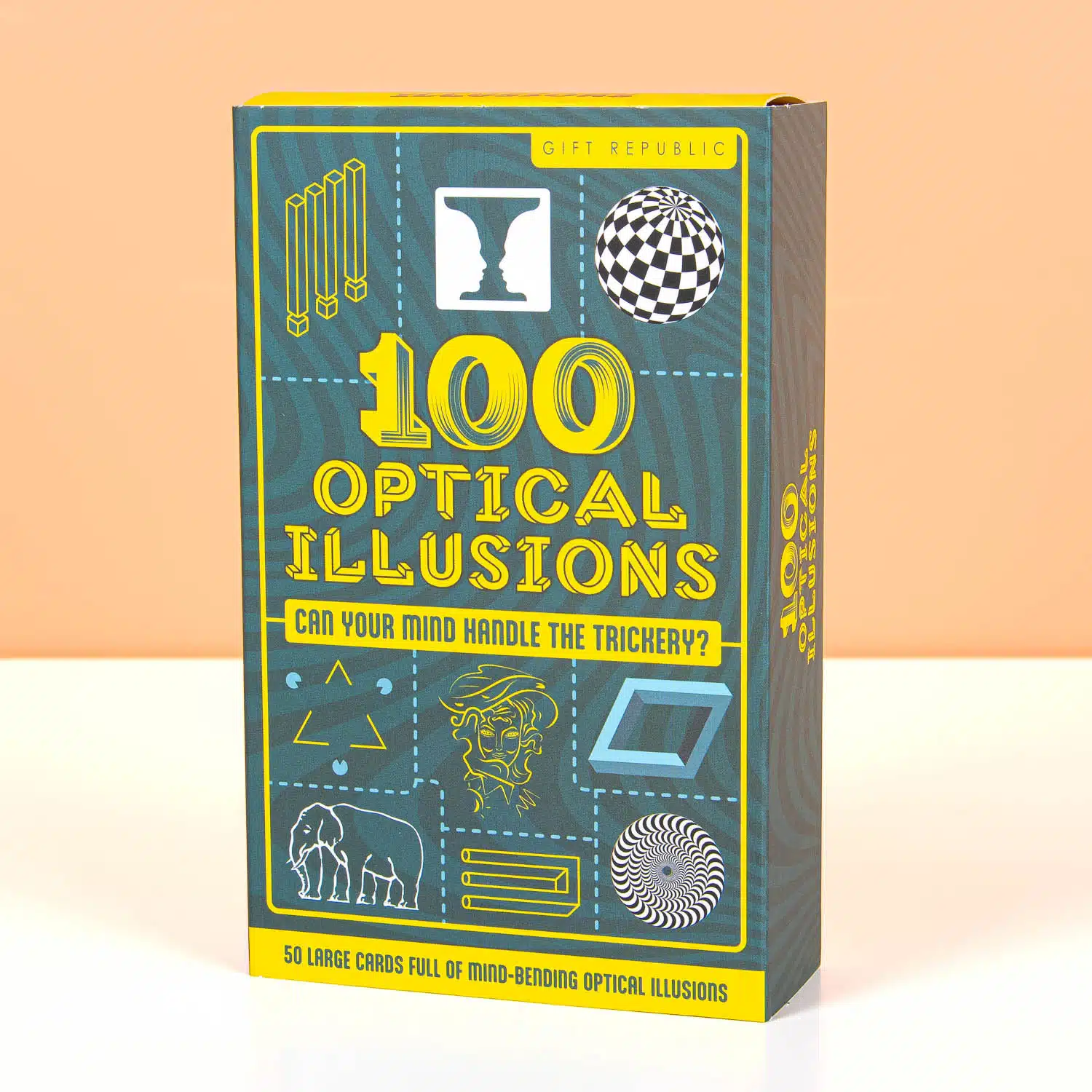 De optische illusiekaarten van Gift Republic zijn voor iedereen die van hersenkrakers houdt. Deze set bevat 50 dubbelzijdige kaarten met maar liefst 100 optische illusies. Boordevol verbijsterende afbeeldingen die je uitdagen en je ogen voor de gek houden. Perfect voor onderweg, als vermaak op een feestje, of gewoon om je hersenen een goede training te geven.