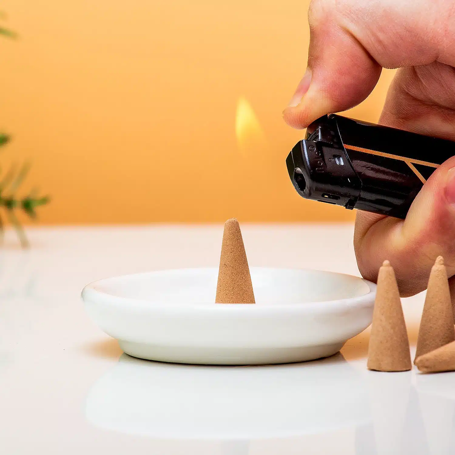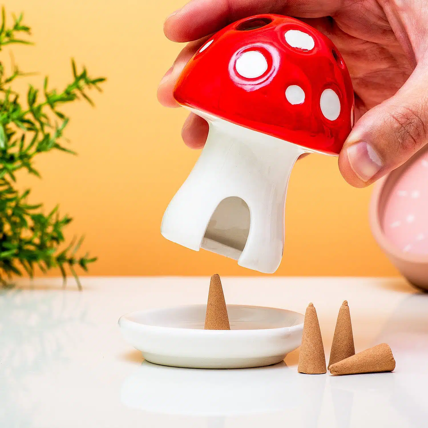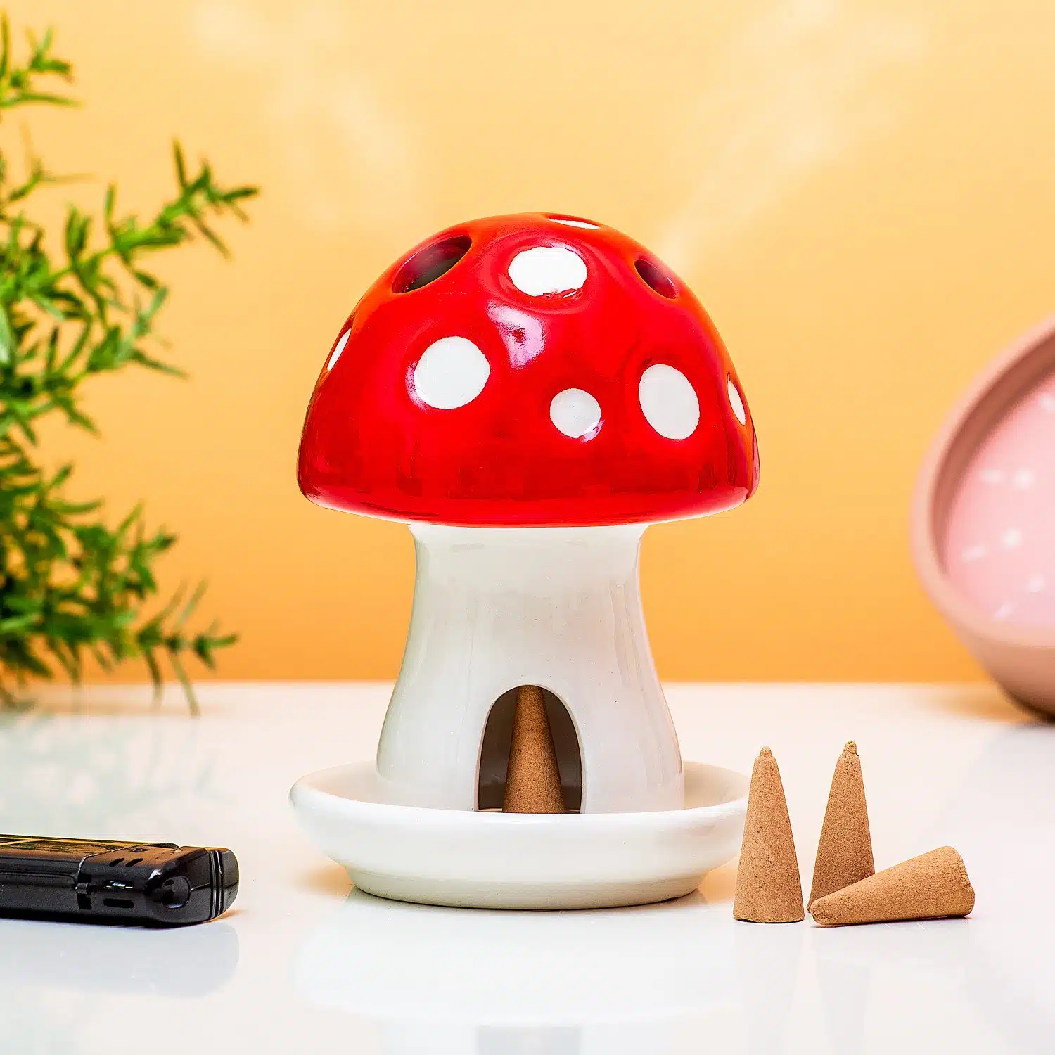 • Komplettes Set mit Pilz, Untertasse und vier Räucherkegeln