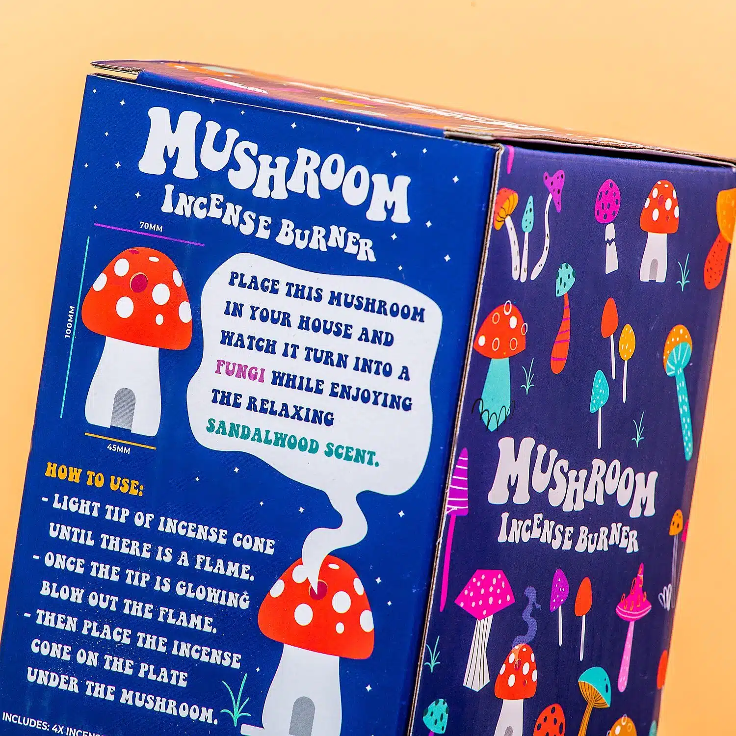 Du legst einen der Räucherkegel auf die Untertasse, zündest ihn an und stülpst dann den Pilz darüber. Das enthaltene Weihrauch duftet herrlich nach Sandelholz.