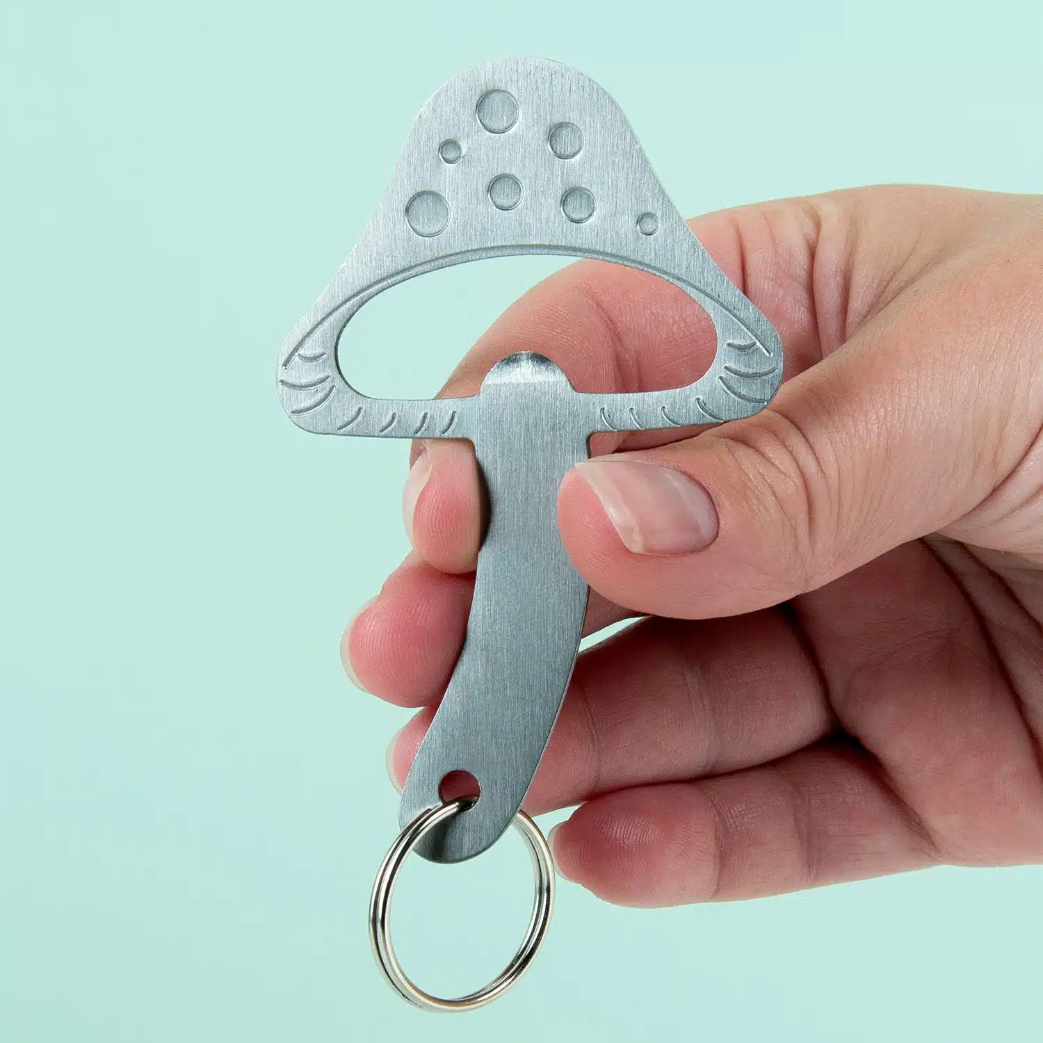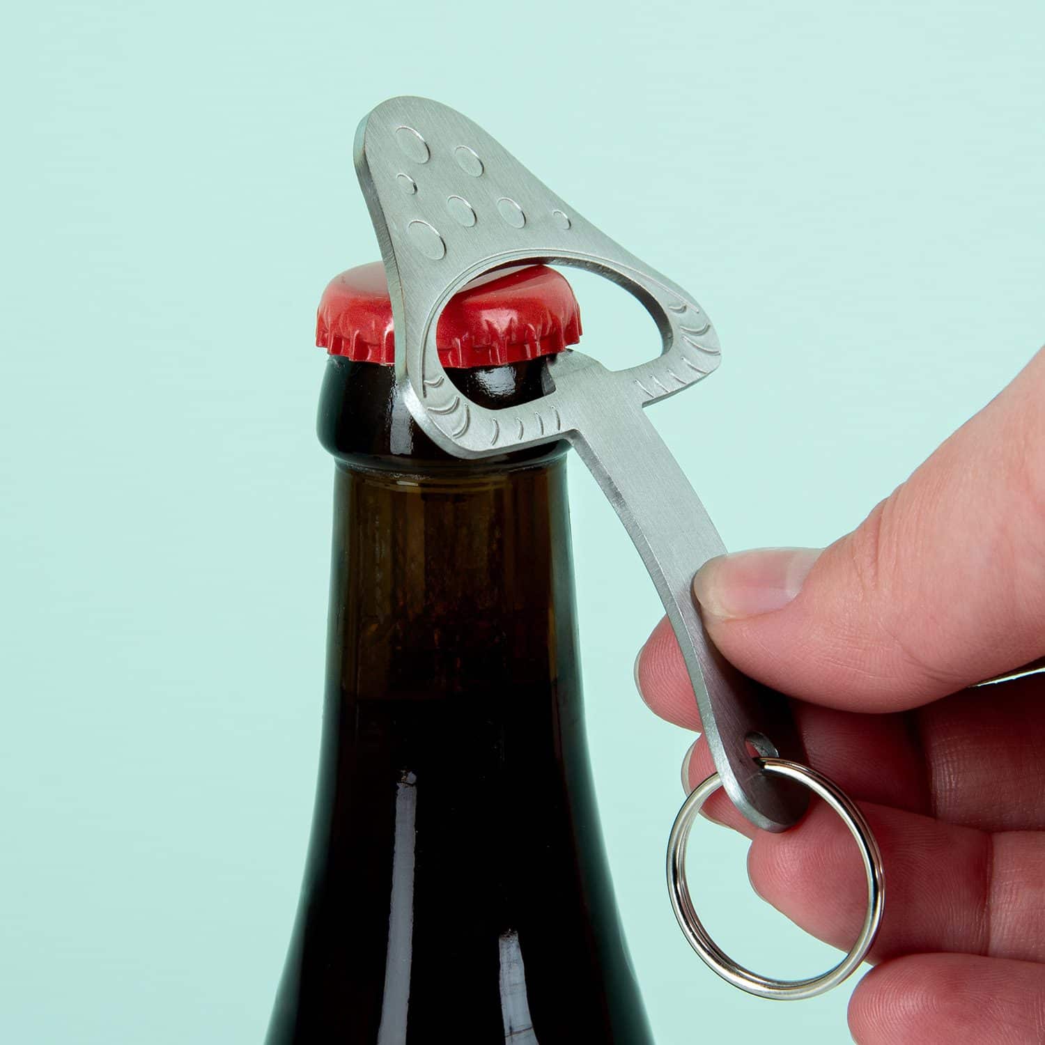 Mit dem Pilz Flaschenöffner von Kikkerland hast du immer einen Bieröffner zur Hand. Dieser magische Pilz hängt nämlich an deinem Schlüsselbund, denn er hat dafür einen speziellen Ring. Auf diese Weise hast du nicht nur einen hübschen Schlüsselanhänger, sondern kannst im Notfall auch jederzeit eine Flasche mit Kronkorken öffnen.