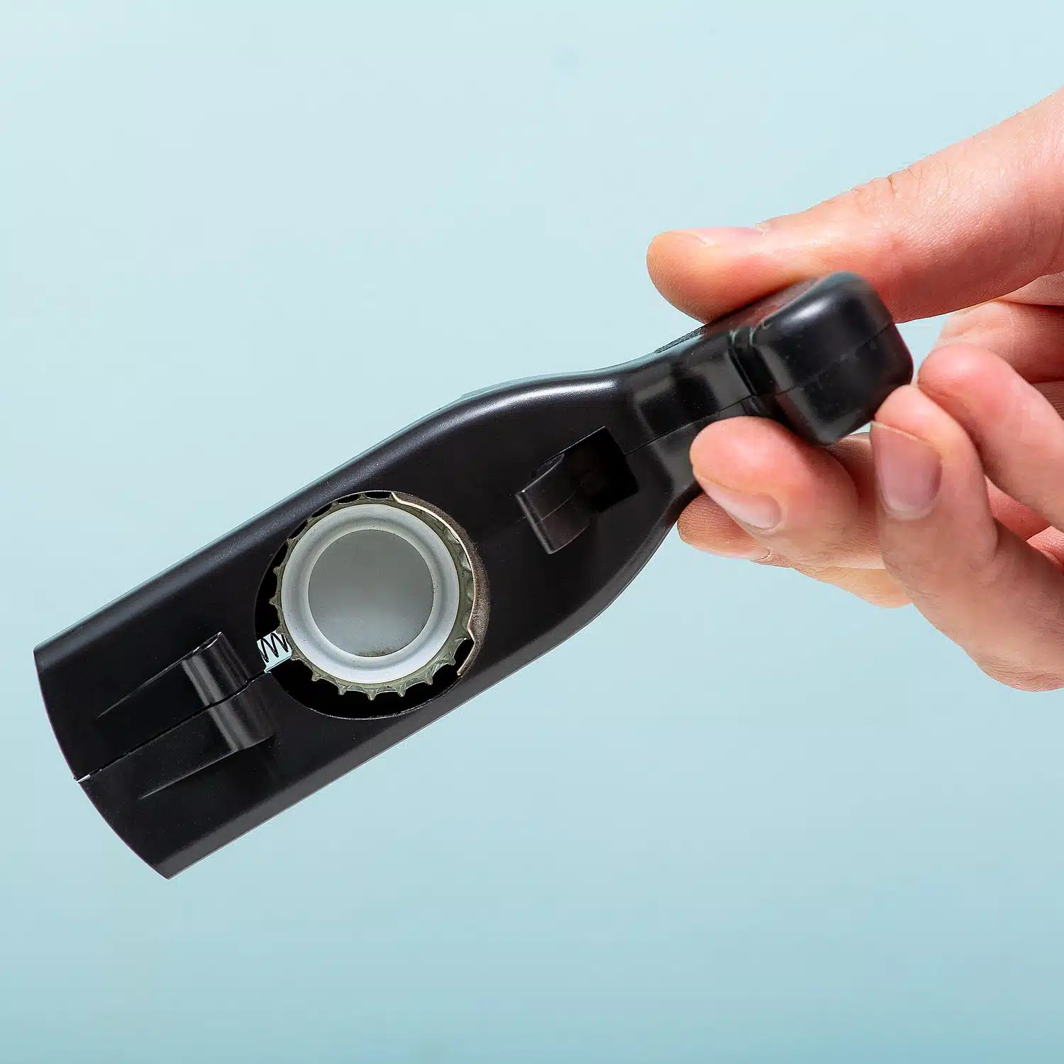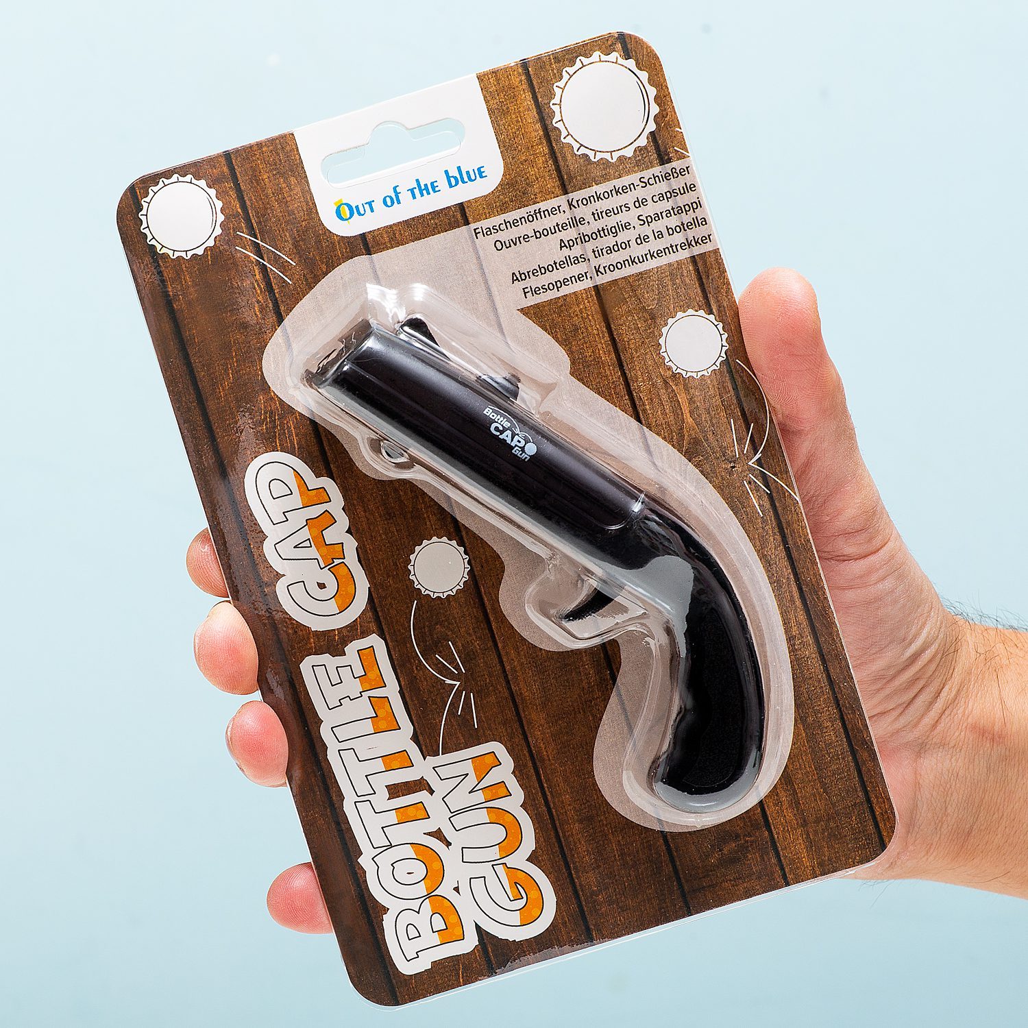 Wie öffnet man auf spielerische Weise eine Flasche Bier? Das machst du mit der Beer Cap Pistole von Out of the Blue. Damit öffnest du zuerst deine Bierflasche und ziehst dann den Abzug zu dir. So kommt der Bierdeckel auf den Markt.Schön, mit Freunden zu konkurrieren, um zu sehen, wer an einem Abend am weitesten schießen kann.