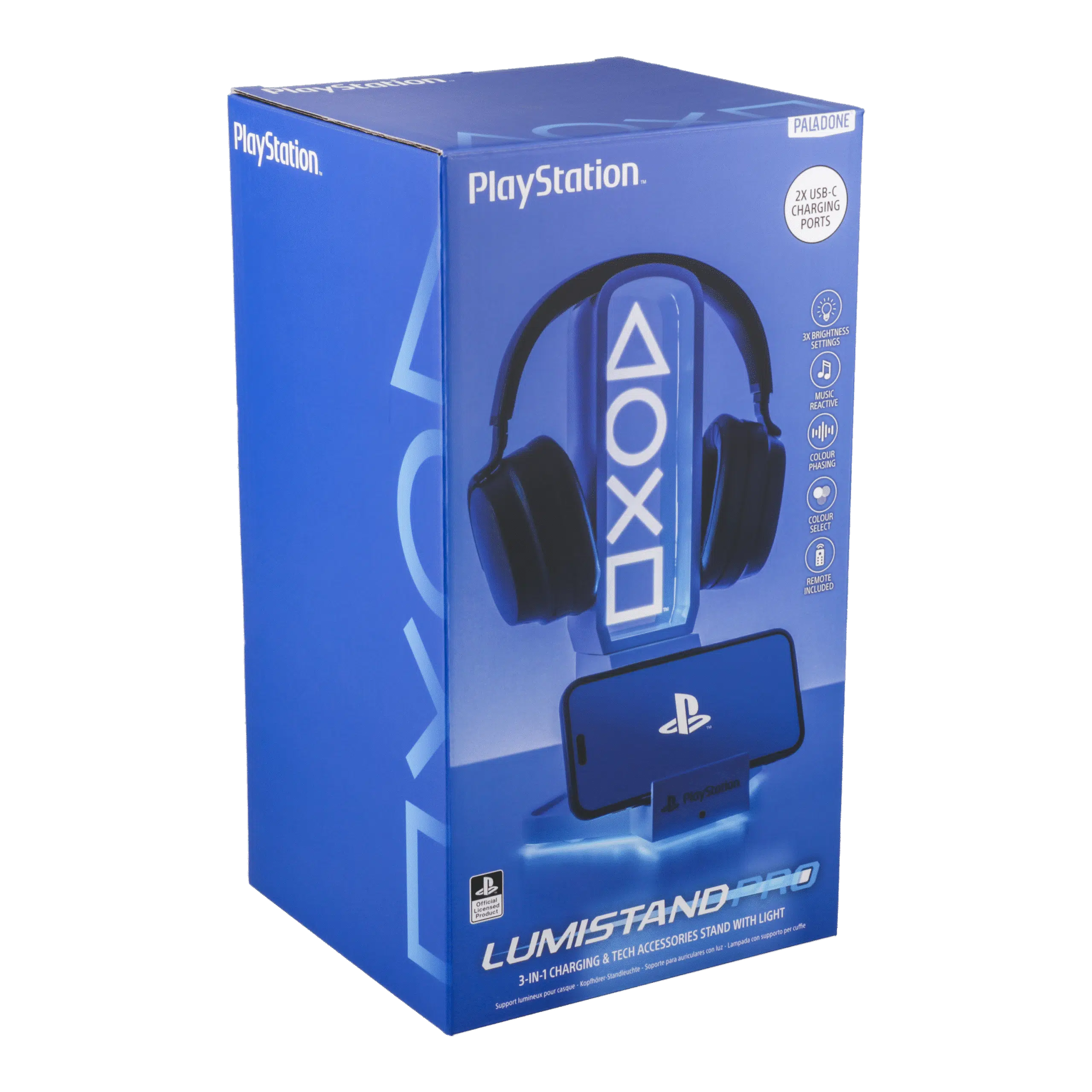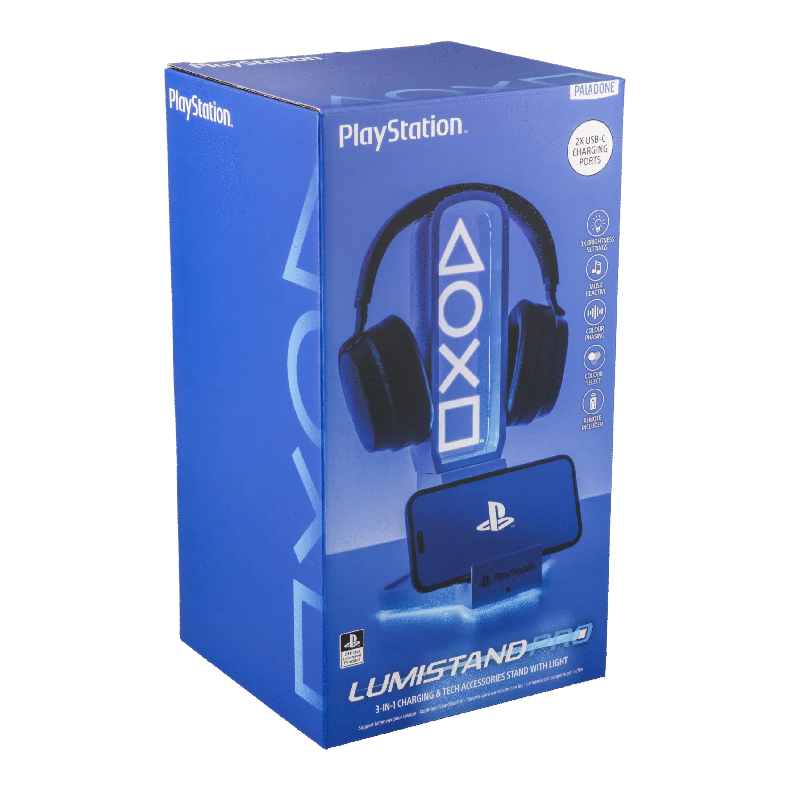 Level up dein Gaming Setup mit PlayStation Stil! Der PlayStation Kopfhörerhalter mit Beleuchtung hat die ikonischen weißen PS5 Icons und blaue Beleuchtung. Nicht nur ein Platz für dein Headset – er ist auch eine Halterung für deinen Controller UND dein Handy. Ihr hat drei Helligkeitsstufen, reagiert auf Musik und hat Color Phasing und Color Select Modi. Alles zu bedienen mit der mitgelieferten Fernbedienung. Ein Must-have für PlayStation-Fans!