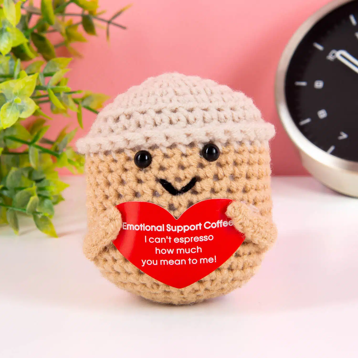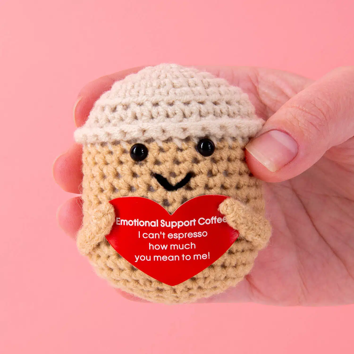 Das positive Espressotässchen ist ein liebevoller, motivierender Muntermacher – in Form einer gehäkelten kleinen Kaffeetasse. Ein süßes Geschenk, um zum Beispiel deine Freundin zu trösten, die gerade von ihrem schrecklichen Ex verlassen wurde. Oder für deine Schwester, die einfach kein Glück zu haben scheint. Die kleine gehäkelte Tasse hält ein Herz in den Händen mit der Botschaft: Emotional support coffee. I can’t espresso how much you mean to me! Ein beliebtes, liebevolles Geschenk, das garantiert gut ankommt.