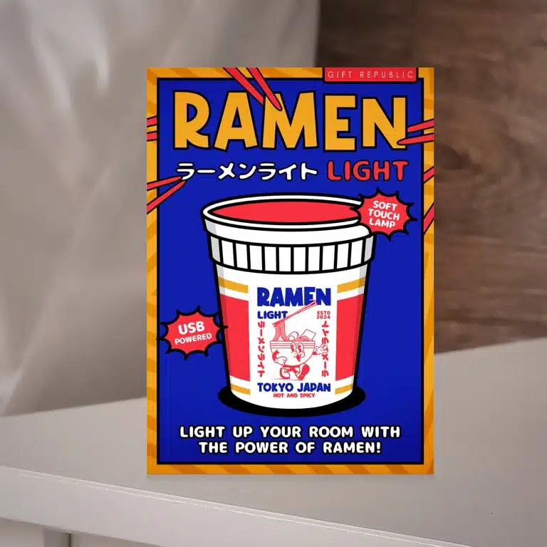 Die Ramen-Lampe von Gift Republic ist eine Lampe in Form eines Ramen-Nudeltopfes โ und nein, du kannst sie nicht essen. Drรผcke den weichen Silikontopf, um zwischen drei Lichtstufen zu wechseln, von stimmungsvoll bis hell. Mit praktischem 30-Minuten-Timer und einem Akku, der bis zu 6 Stunden hรคlt, ist dies die ultimative Lampe fรผr Studentenzimmer, Bรผros oder jeden, der eigenwillige Dekoration liebt. Sie kocht nicht รผber, macht keine Unordnung und du musst sie nie abwaschen!