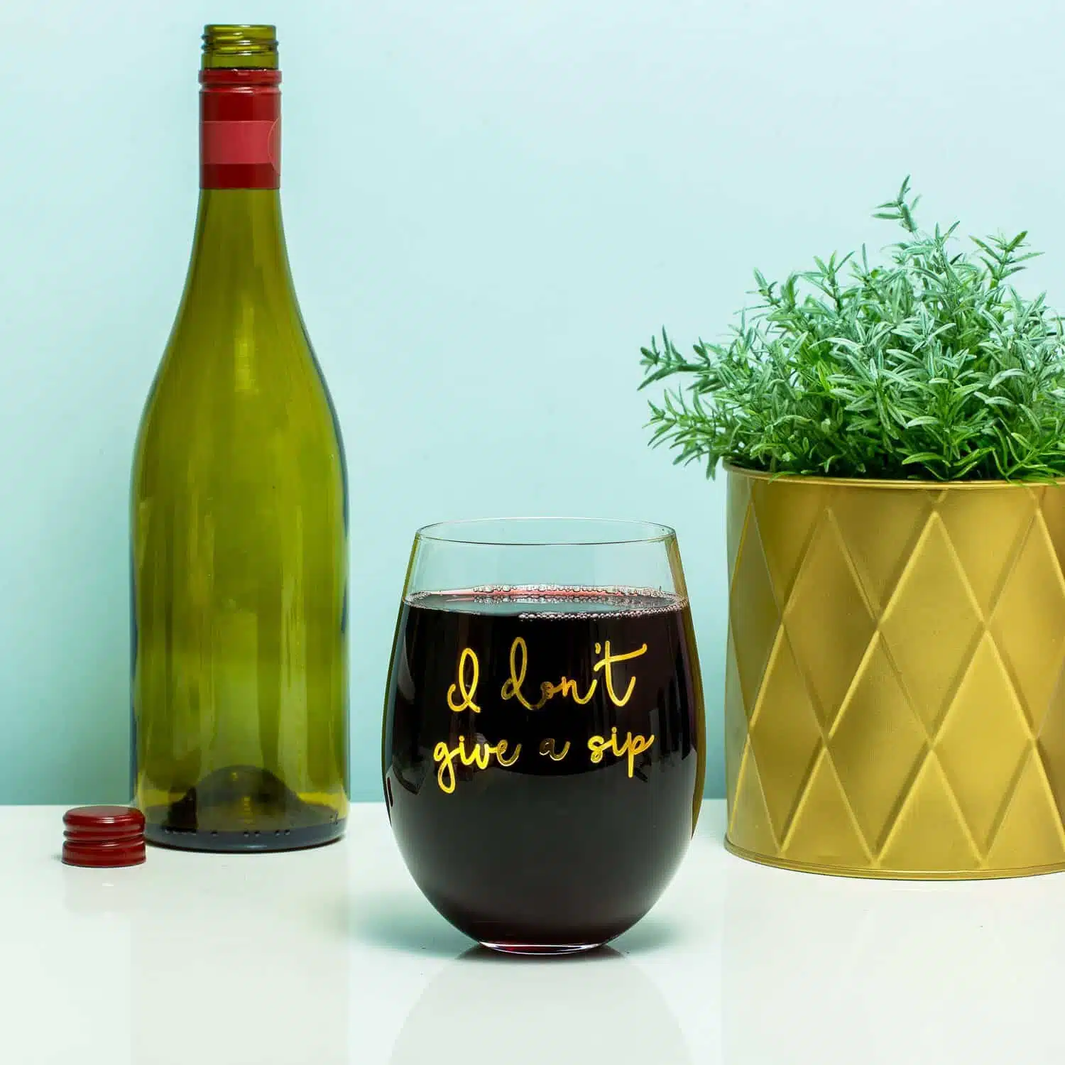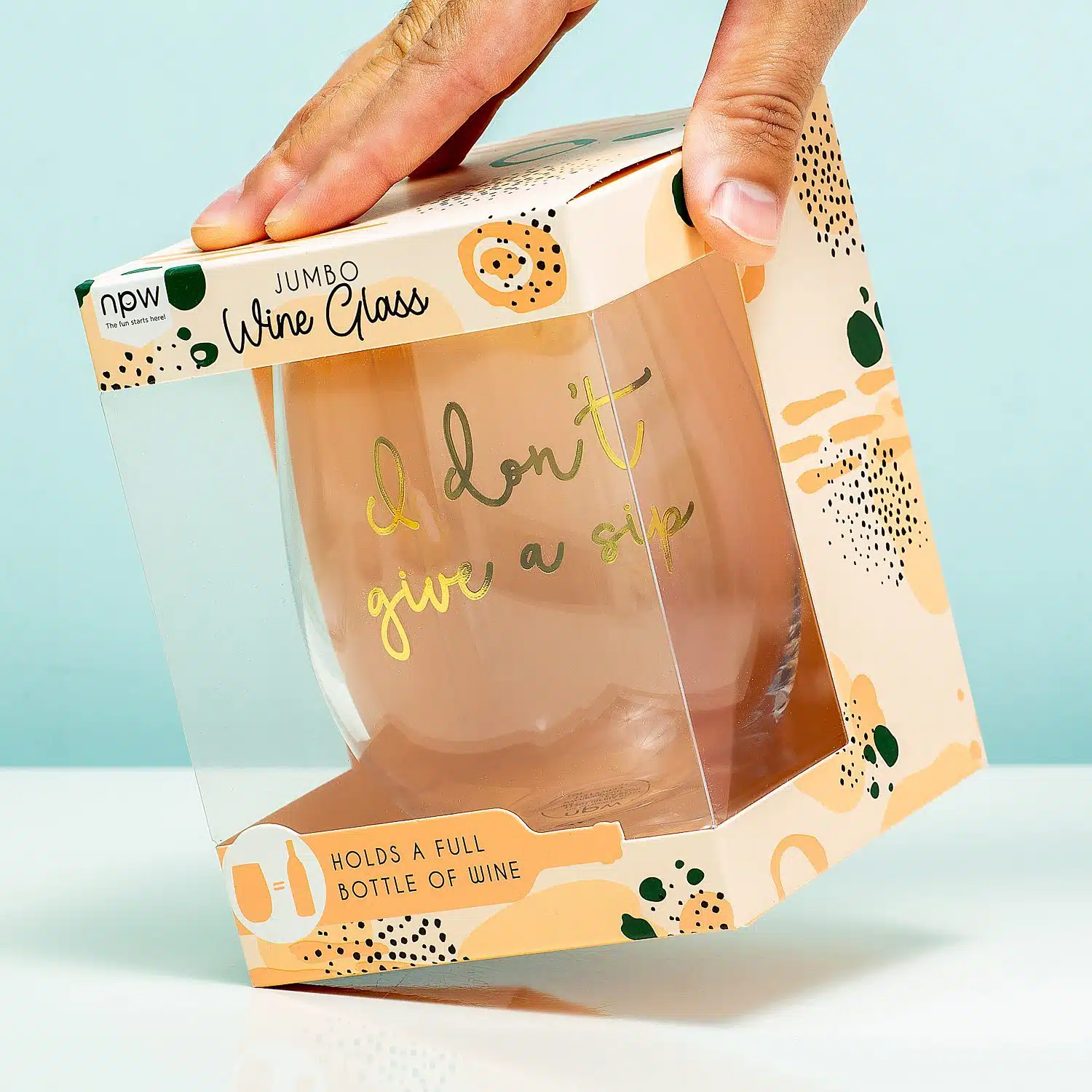 Wo ist diese Party? Mit dem Giant Weinglas (800 ml) von NPW London sind Sie bestens gerรผstet. Dieses extra groรe Weinglas hat ein Fassungsvermรถgen von 800 Millilitern, sodass eine ganze Flasche Wein hineinpasst. So wird der Ausdruck โein Glas dannโ fรผr Weintrinker plรถtzlich sehr attraktiv! Auf dem stiellosen Glas steht in goldenen Buchstaben auf der Vorderseite das Zitat โI don’t give a sipโ.
